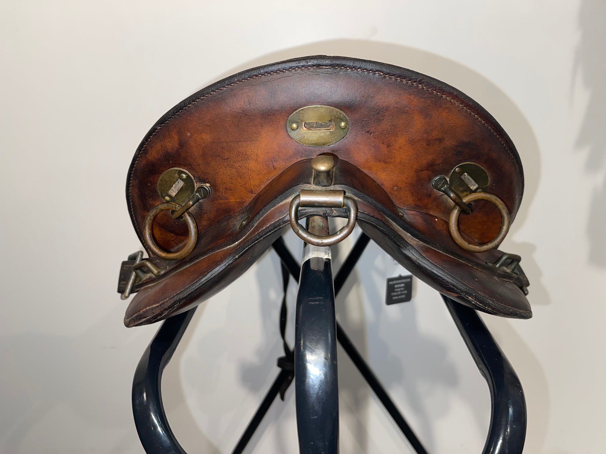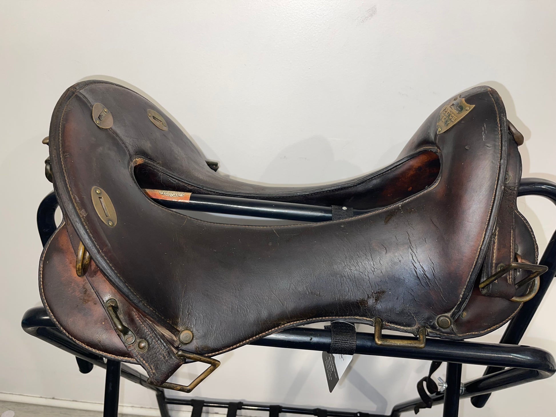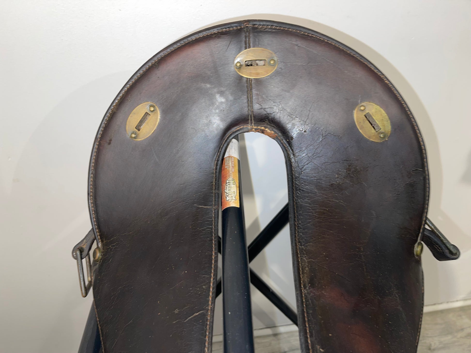 McClellan U.S. Calvary saddle. The saddle features a wonderfully and professionally crafted wood and leather construction that features a iconic McClellan traditional design to this saddle that shows a dark brown to black coloration ot the leather and shows brass adornments with rings featured on the back of the high back seat and shows a plaque on the inside of the swells of the saddle that reads: 12 inch seat. The McClellan saddle was a riding saddle designed by George B. McClellan, after his tour of Europe as the member of a military commission charged with studying the latest developments in engineer and cavalry forces including field equipment. Based on his observations, McClellan proposed a design that was adopted by the Army in 1859. The McClellan saddle was a success and continued in use in various forms until the US Army's last horse cavalry and horse artillery was dismounted late in World War II.
