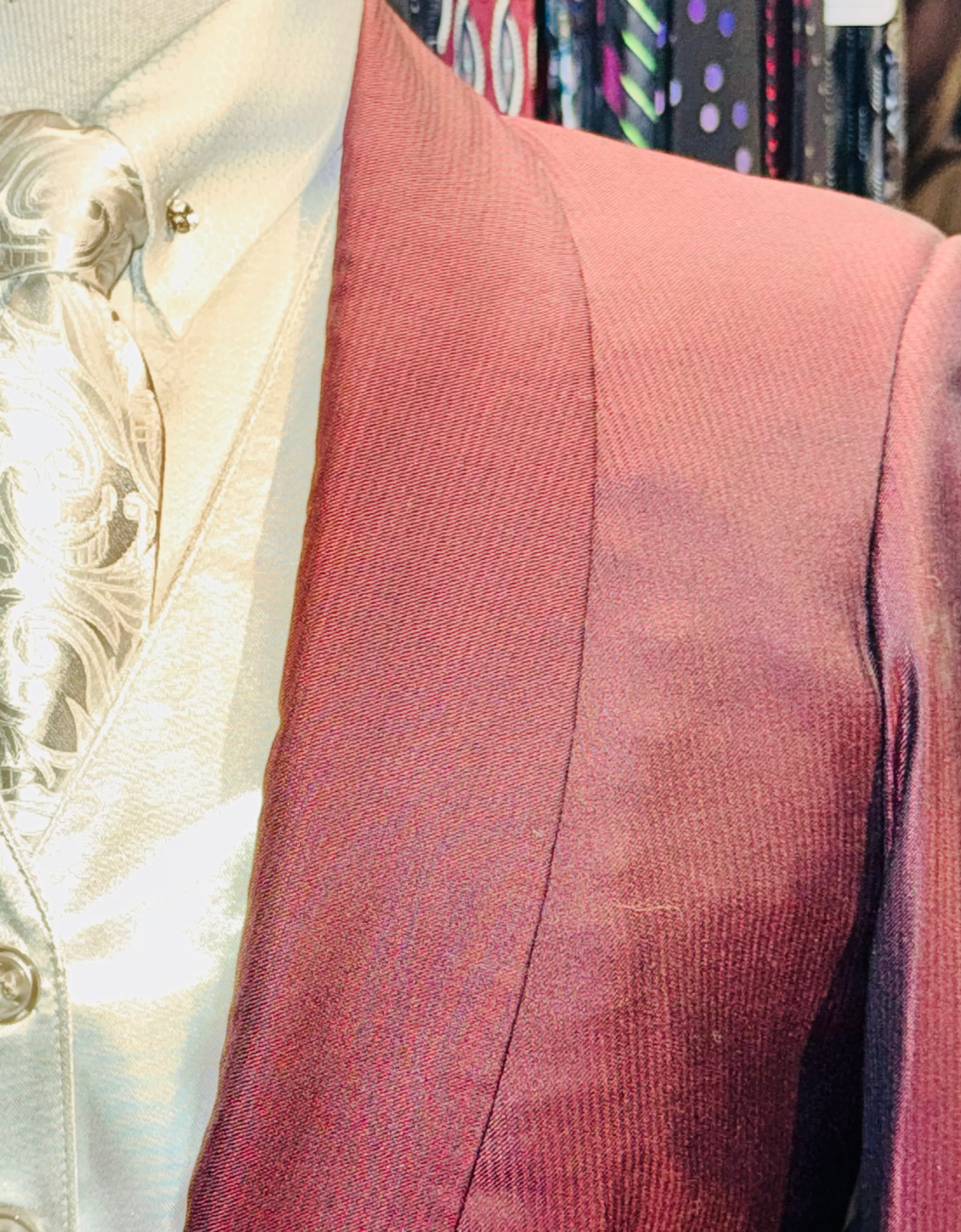 Consigned, excellent condition, maroon with a small shadow stripe pattern.