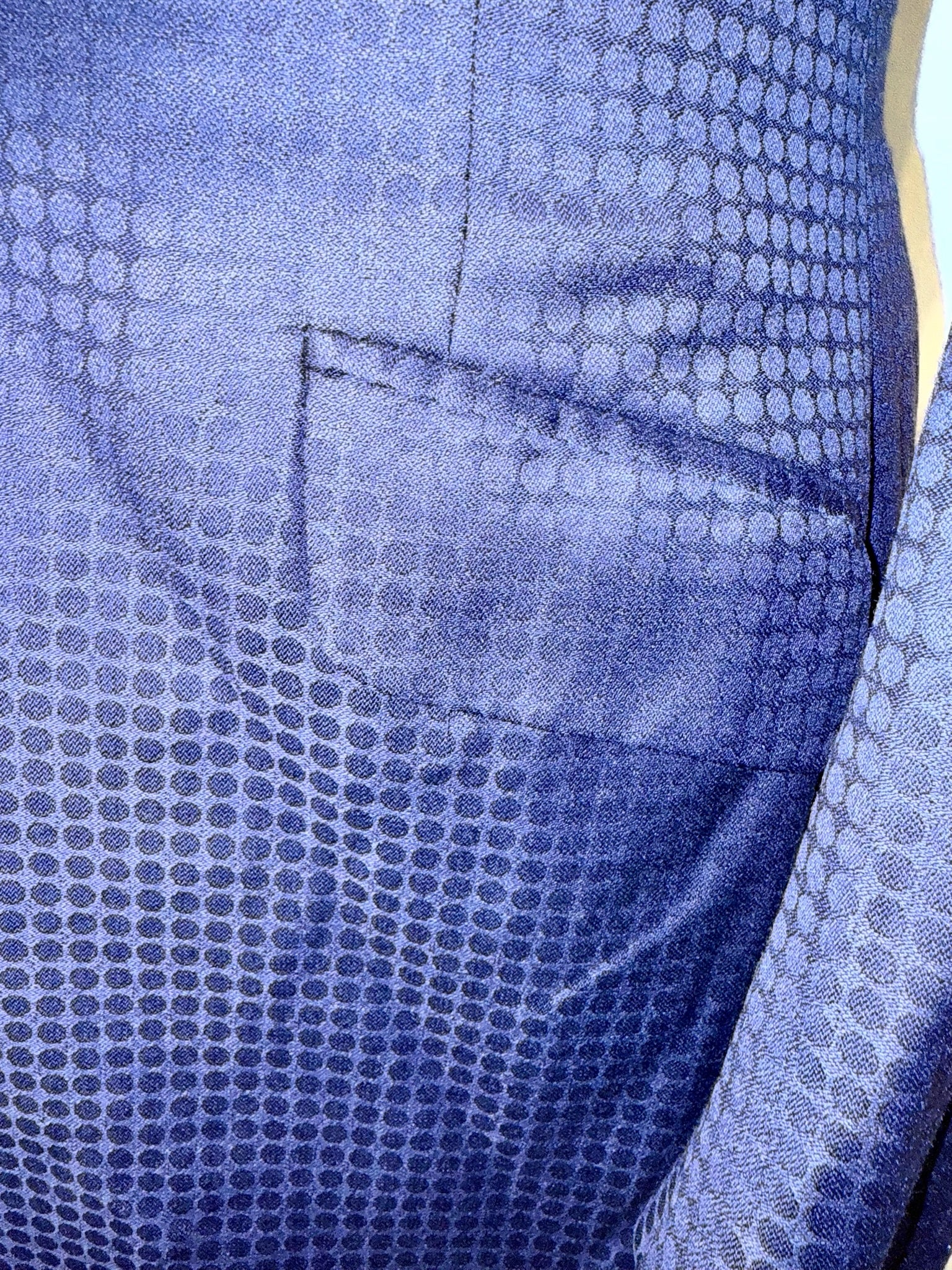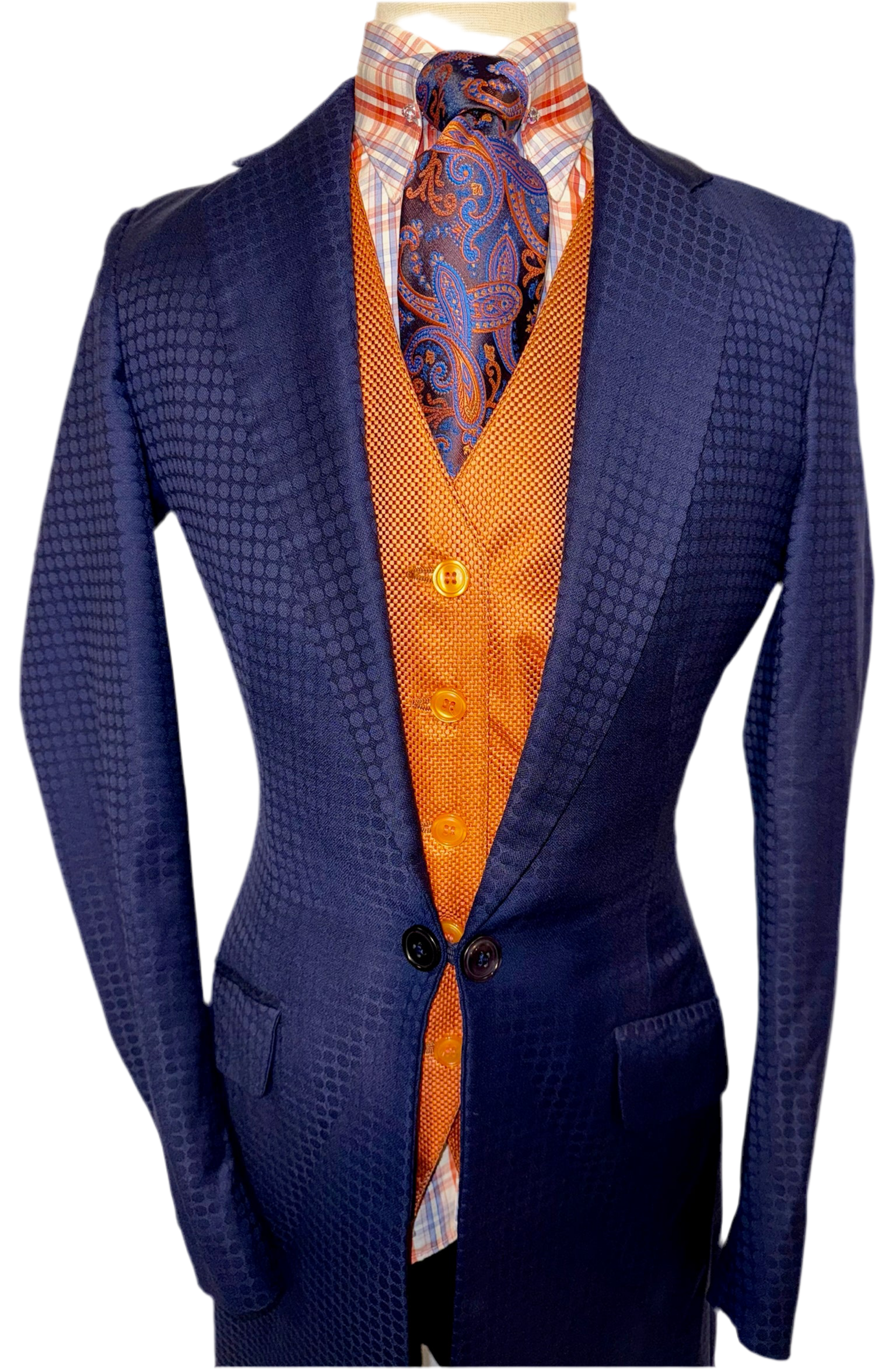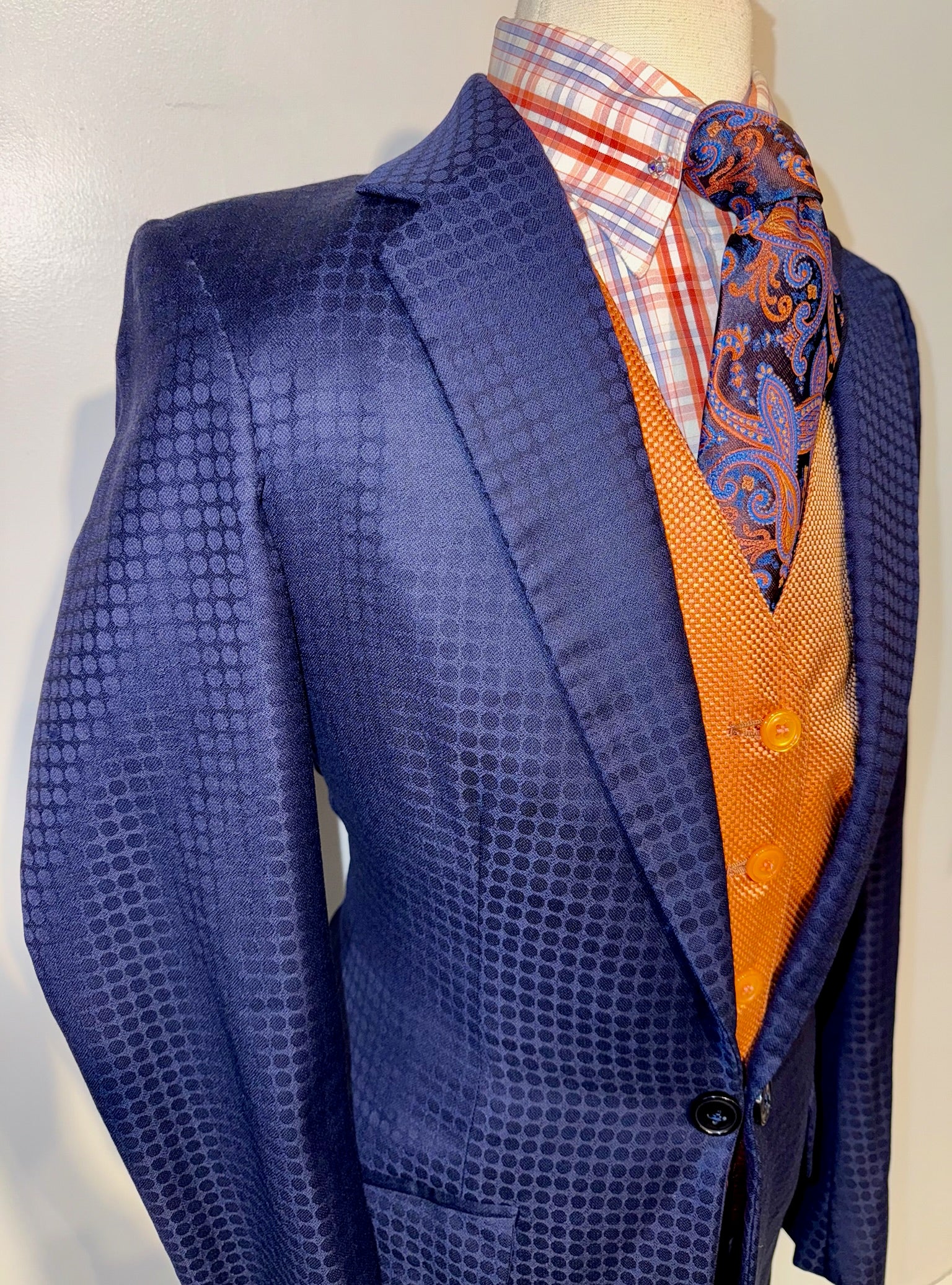 Becker Brothers, teen/ladies day suit in a bright navy with a circle pattern. This sought after option is in excellent condition.it approximately fits a youth 16/ladies 0.