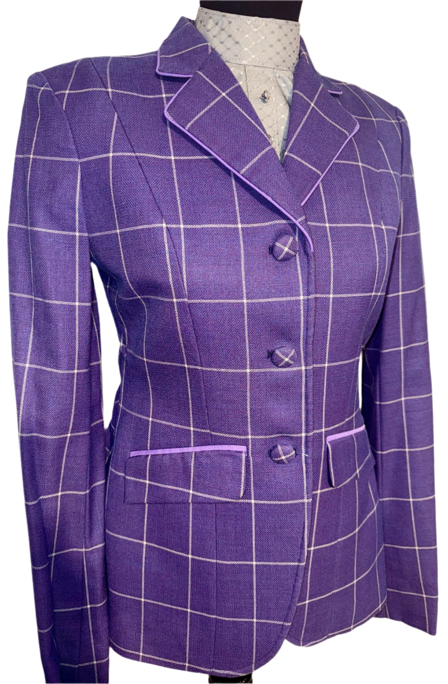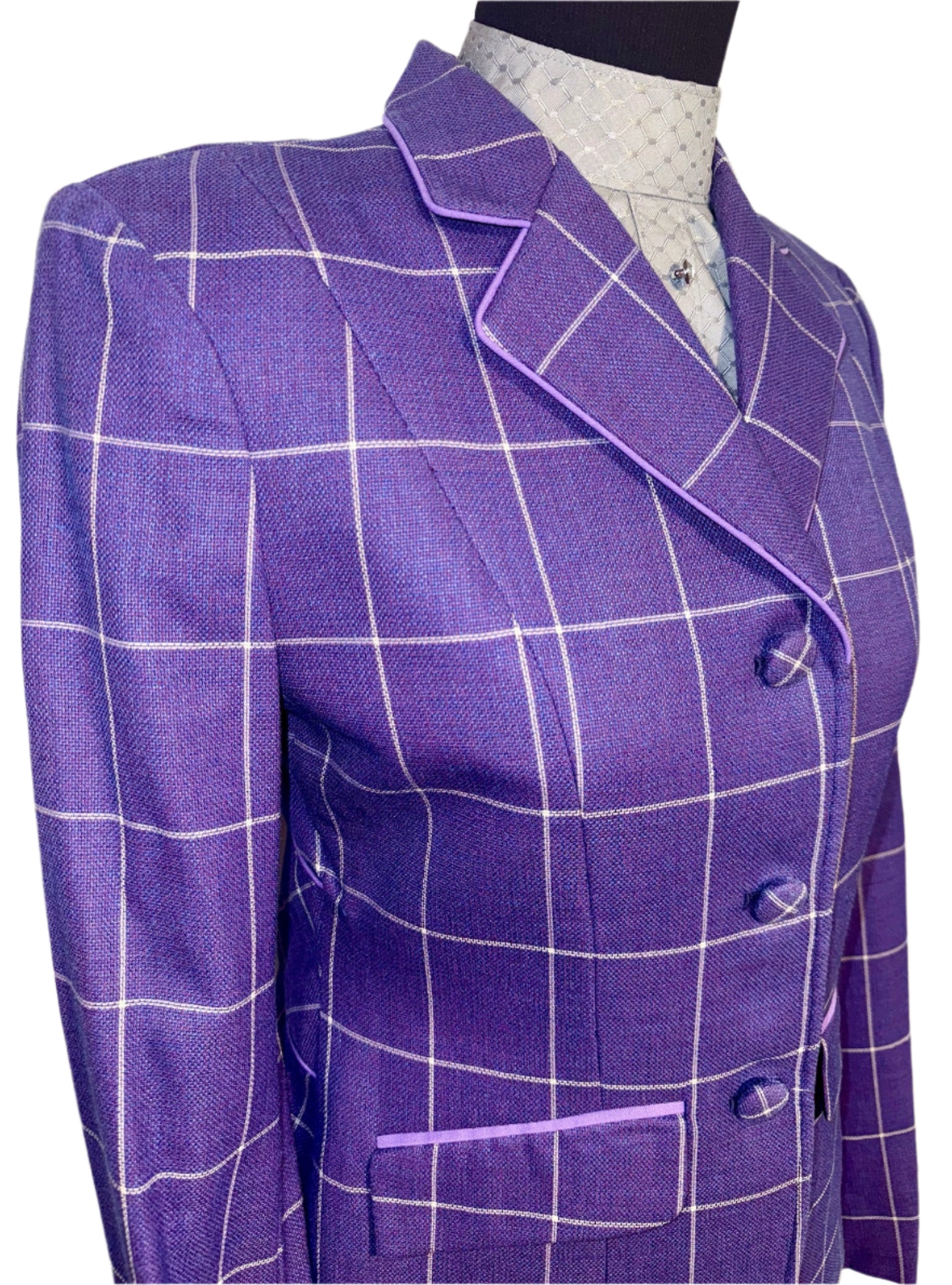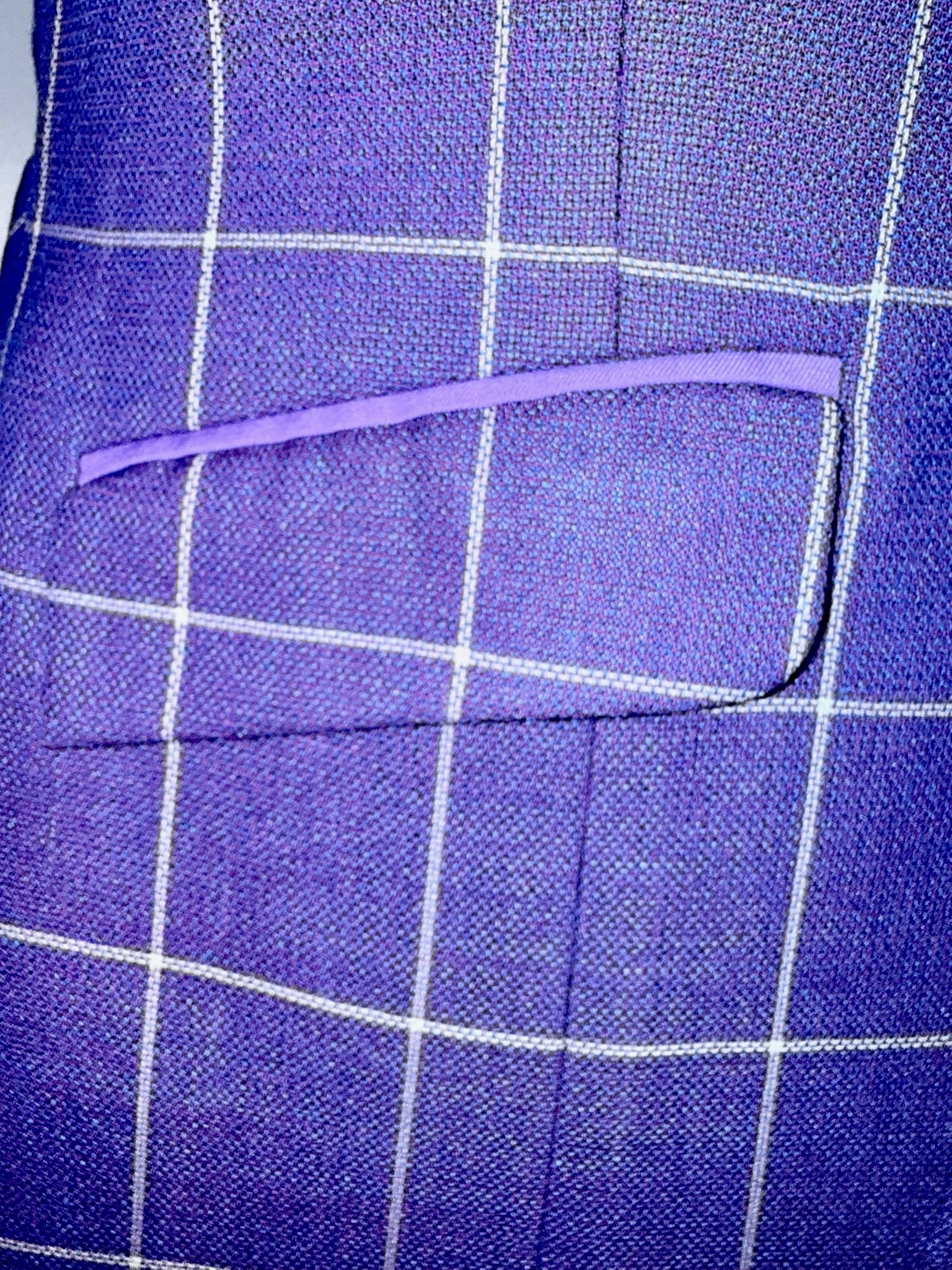 Consigned, excellent condition, purple with a fuchsia undertone, white windowpane, and lavender piping. Approximately fits a ladies size 8/10 long with lots of let out remaining.
