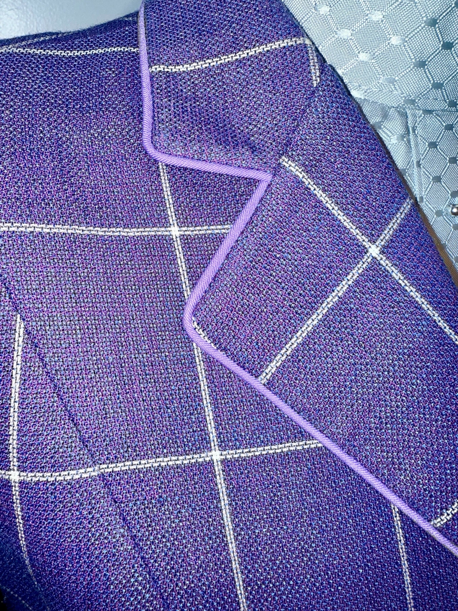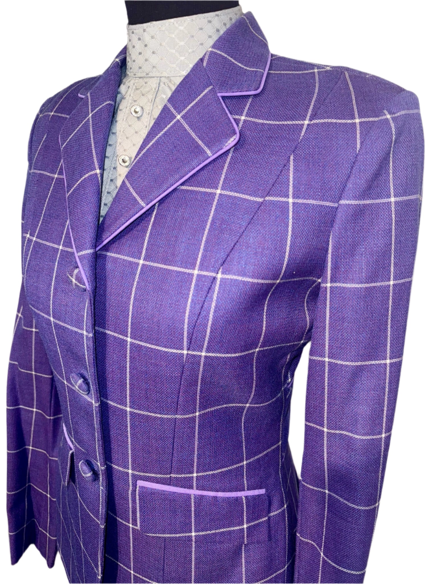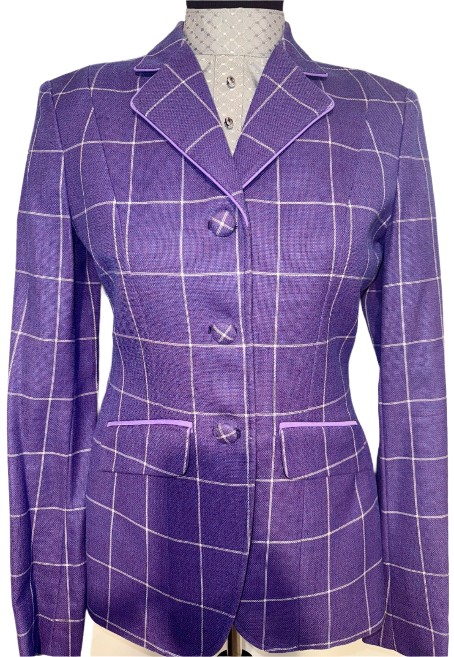 Consigned, excellent condition, purple with a fuchsia undertone, white windowpane, and lavender piping. Approximately fits a ladies size 8/10 long with lots of let out remaining.