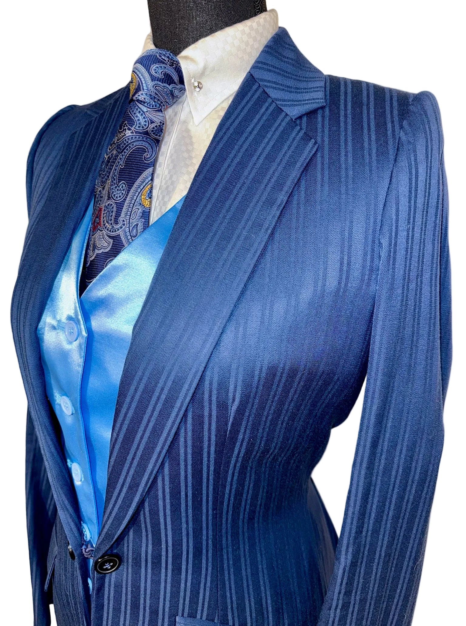 Consigned, Hawkewood, excellent condition, blue with a tone-on-tone stripe. This elongating option approximately fits a ladies size 4/6 with lots of length.