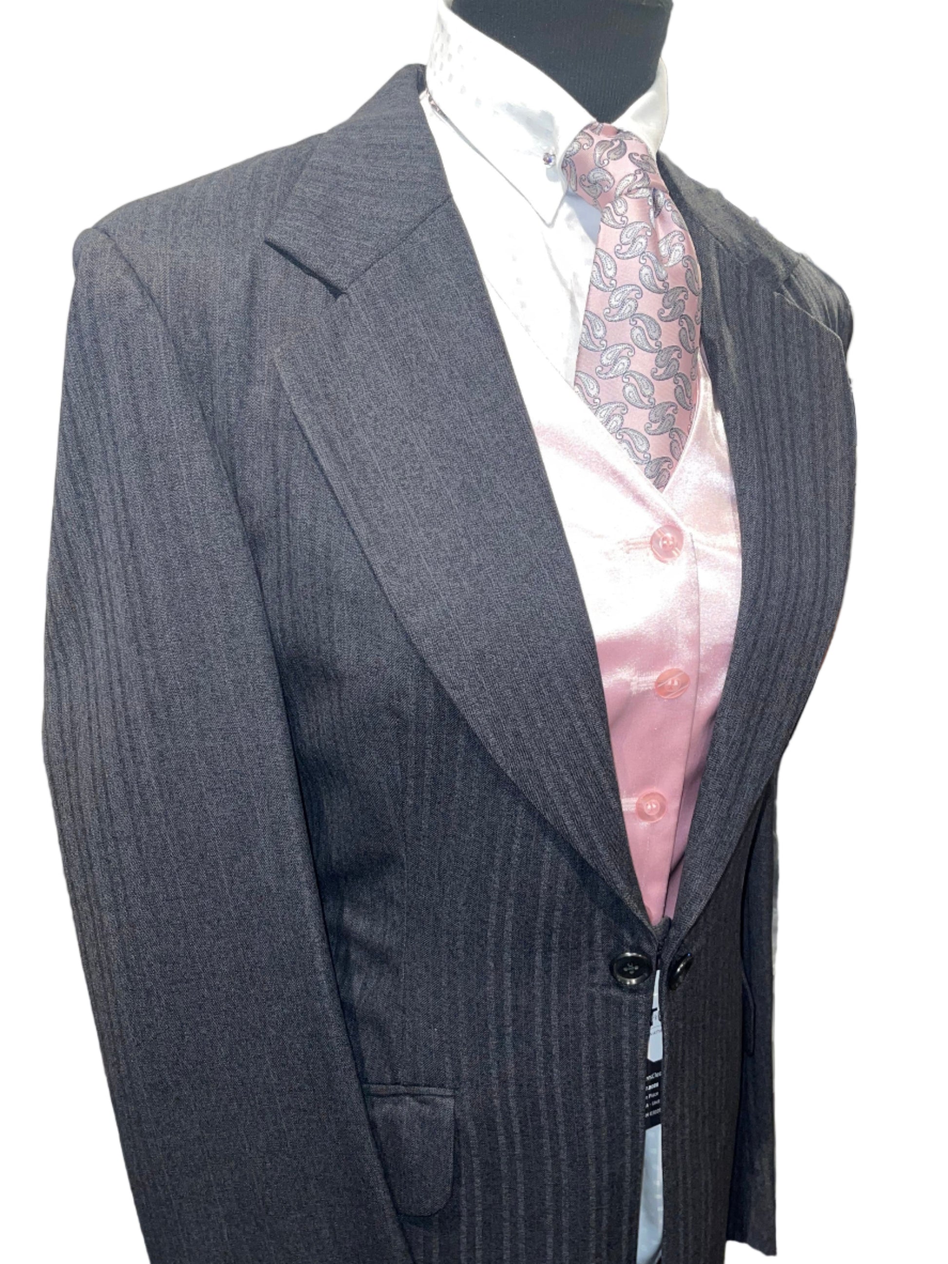 Consigned, excellent condition, gray with a subtle mauve stripe, matching vest and 2 pairs of jods.