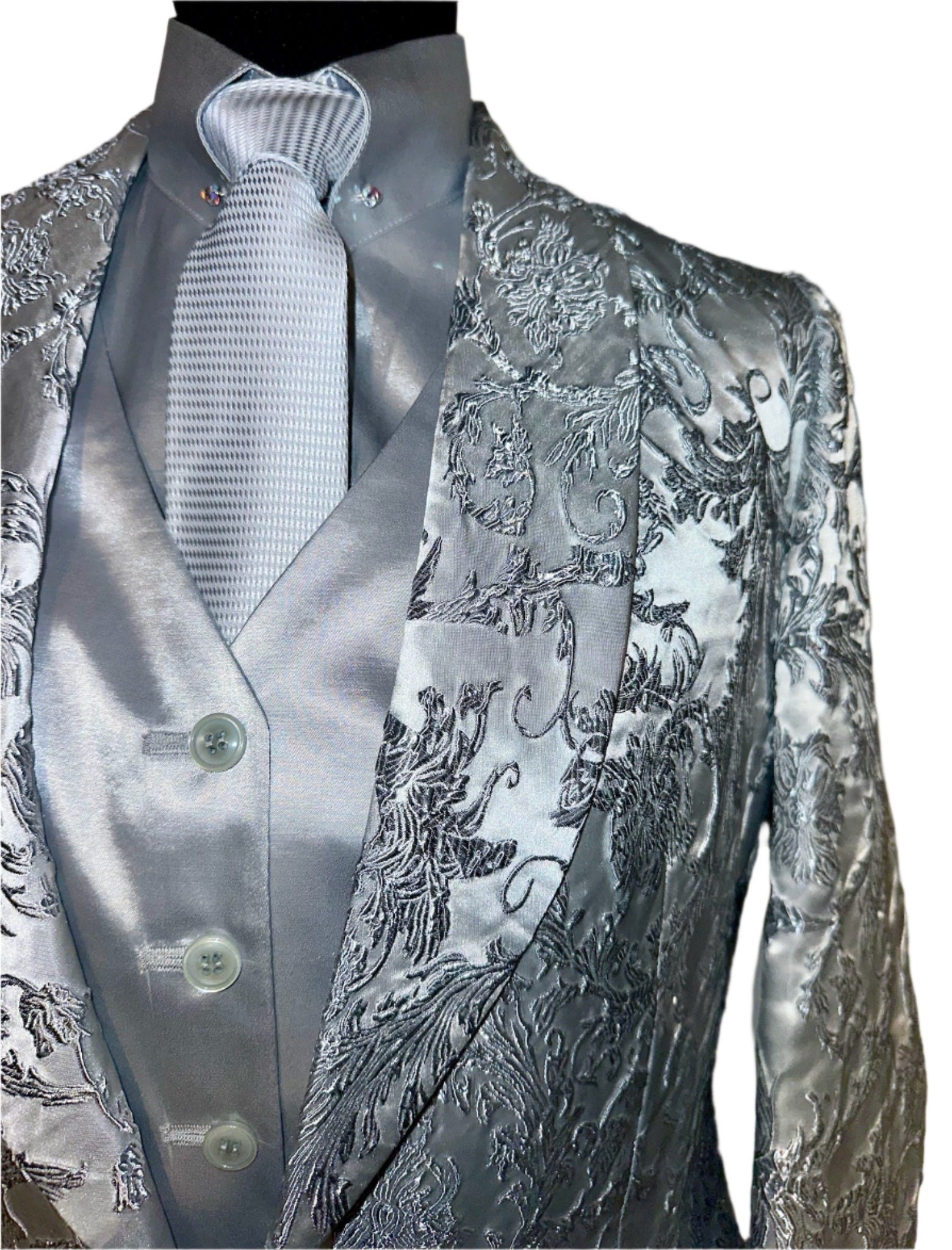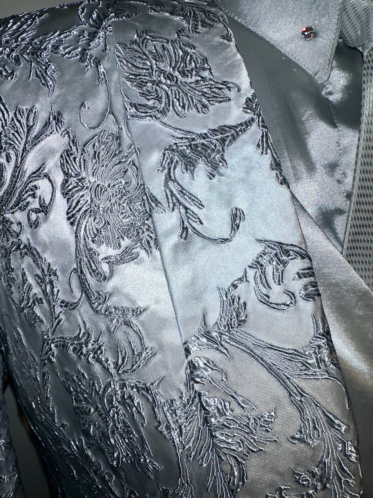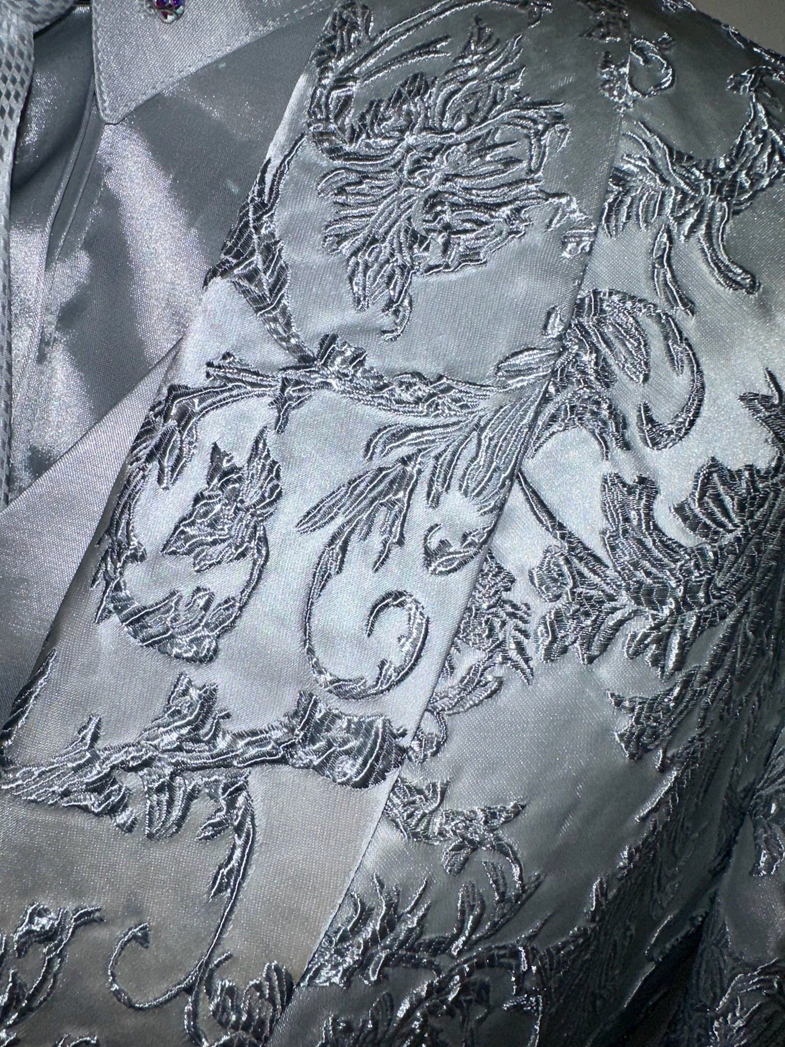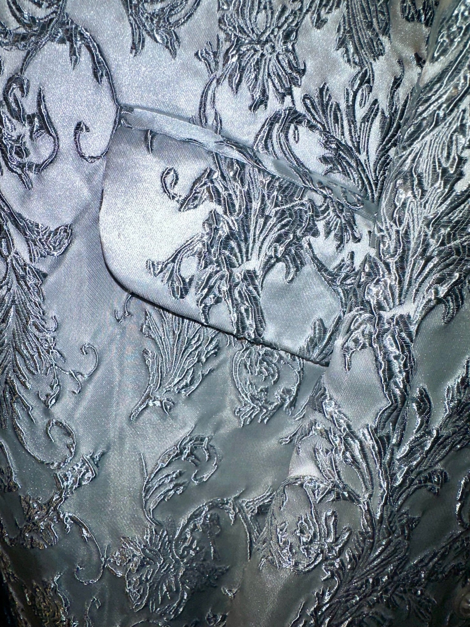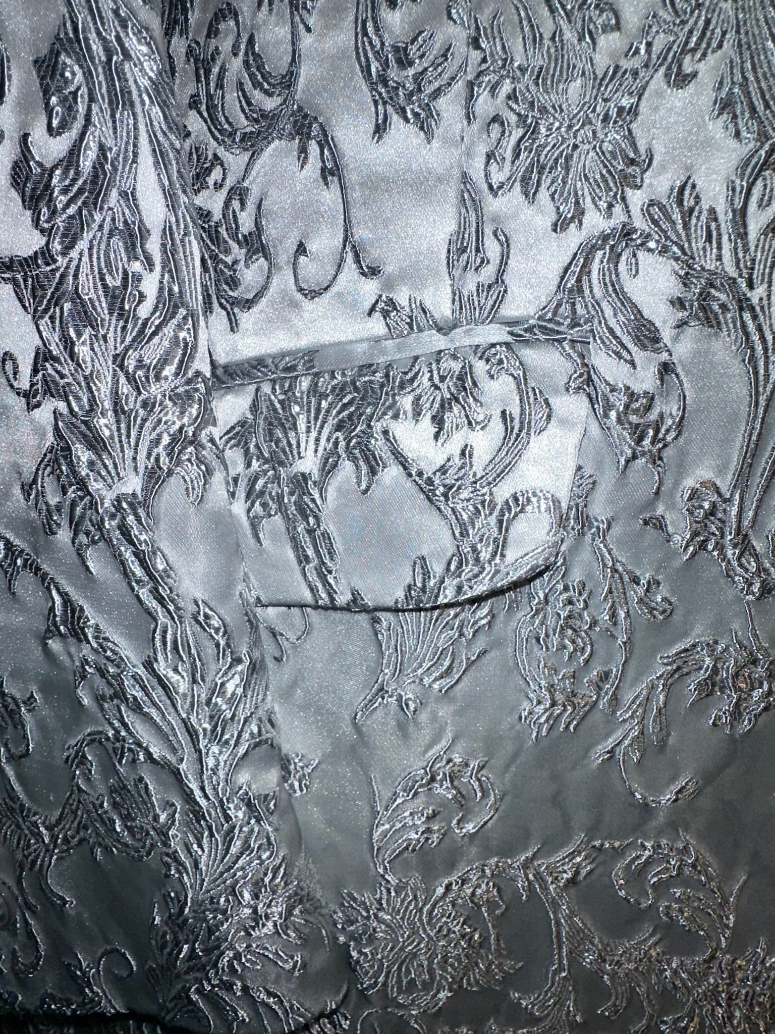 Consigned, like-new condition, beautiful silver brocade, approximately fits a ladies size 10, with lots of additional let out.