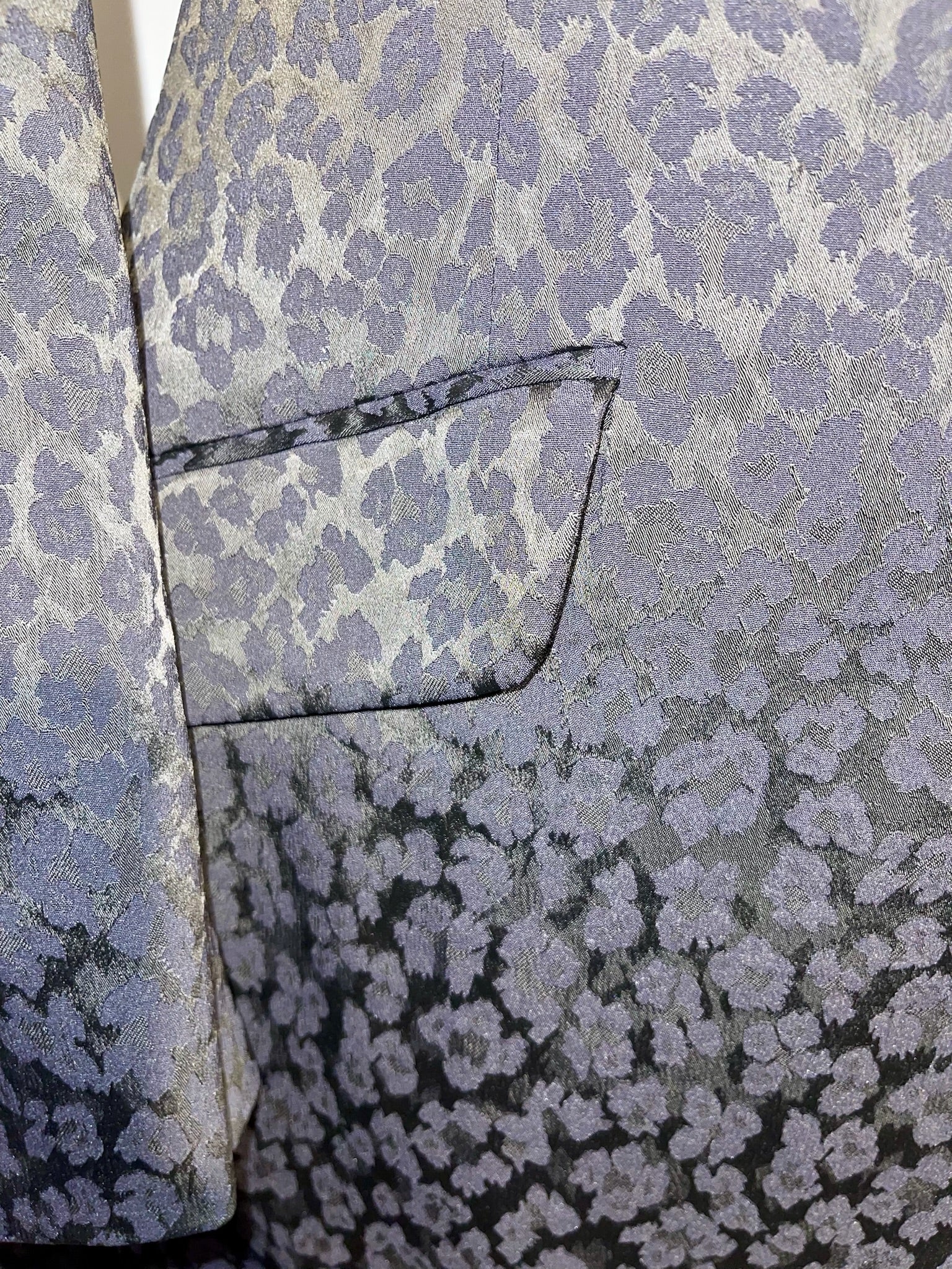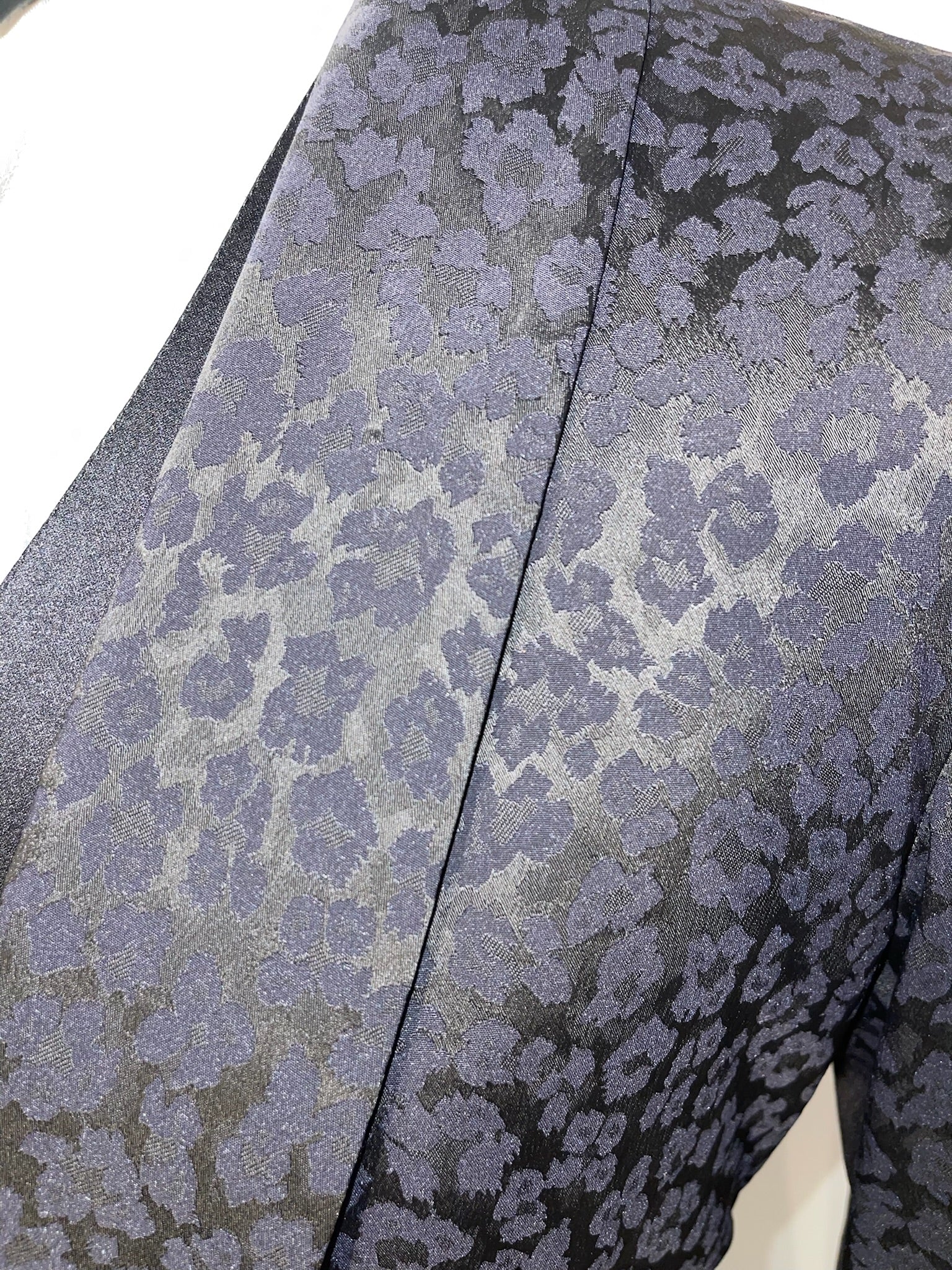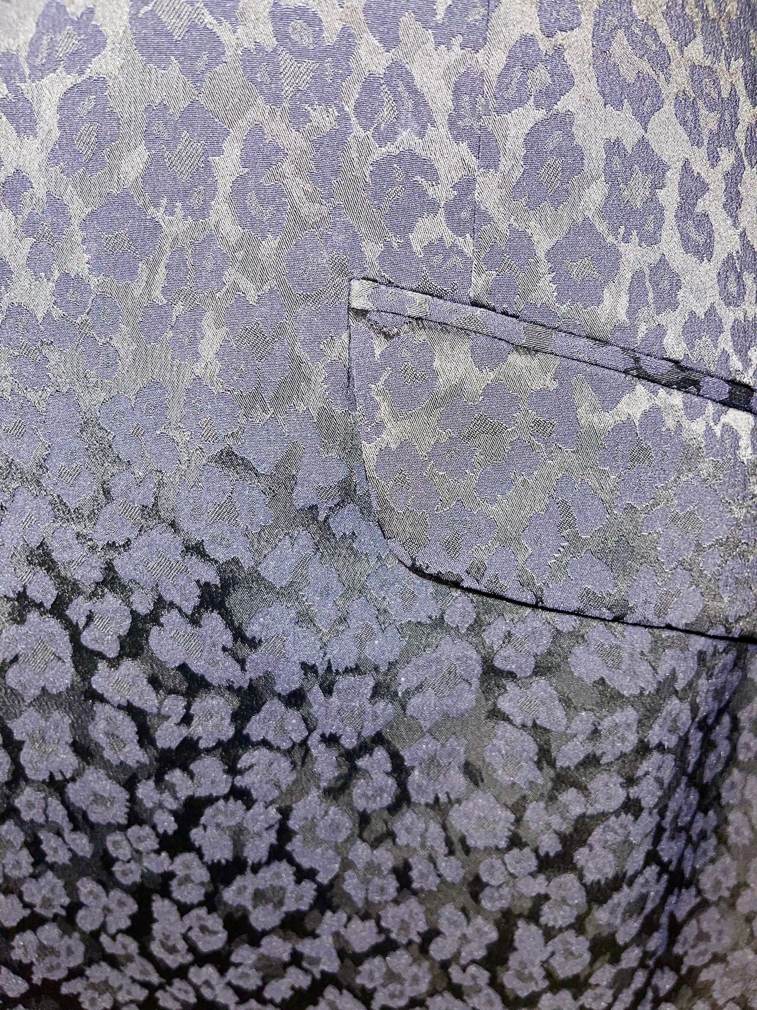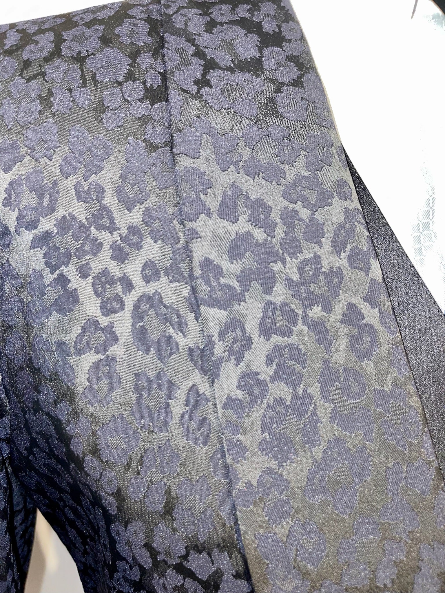 Consigned, excellent condition, black with a midnight navy cheetah print. It approximately fits a ladies size 10/12, with all the original let out remaining.