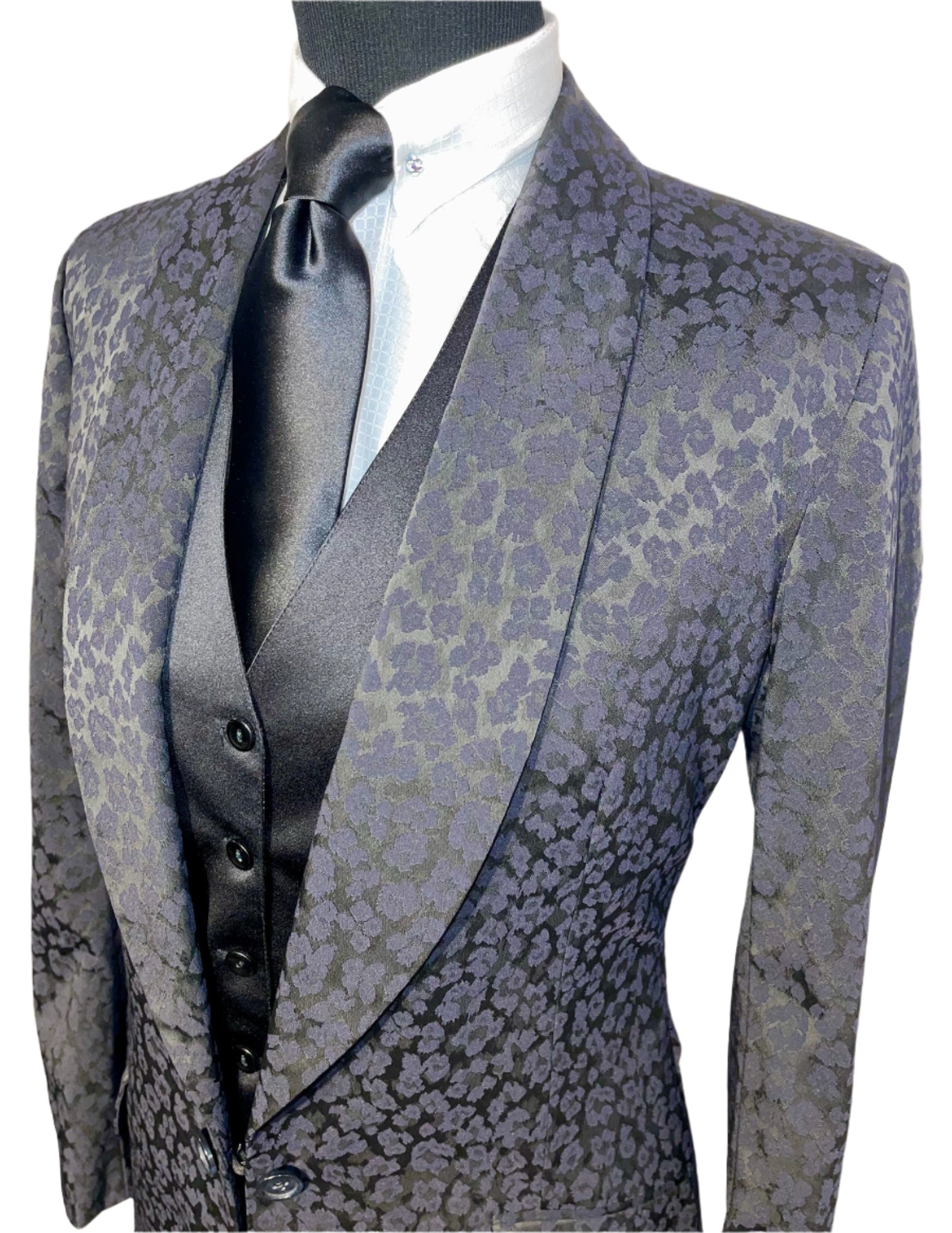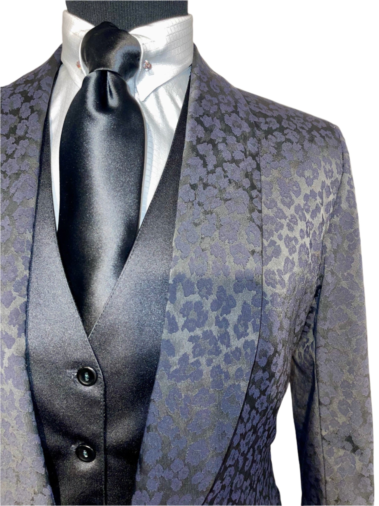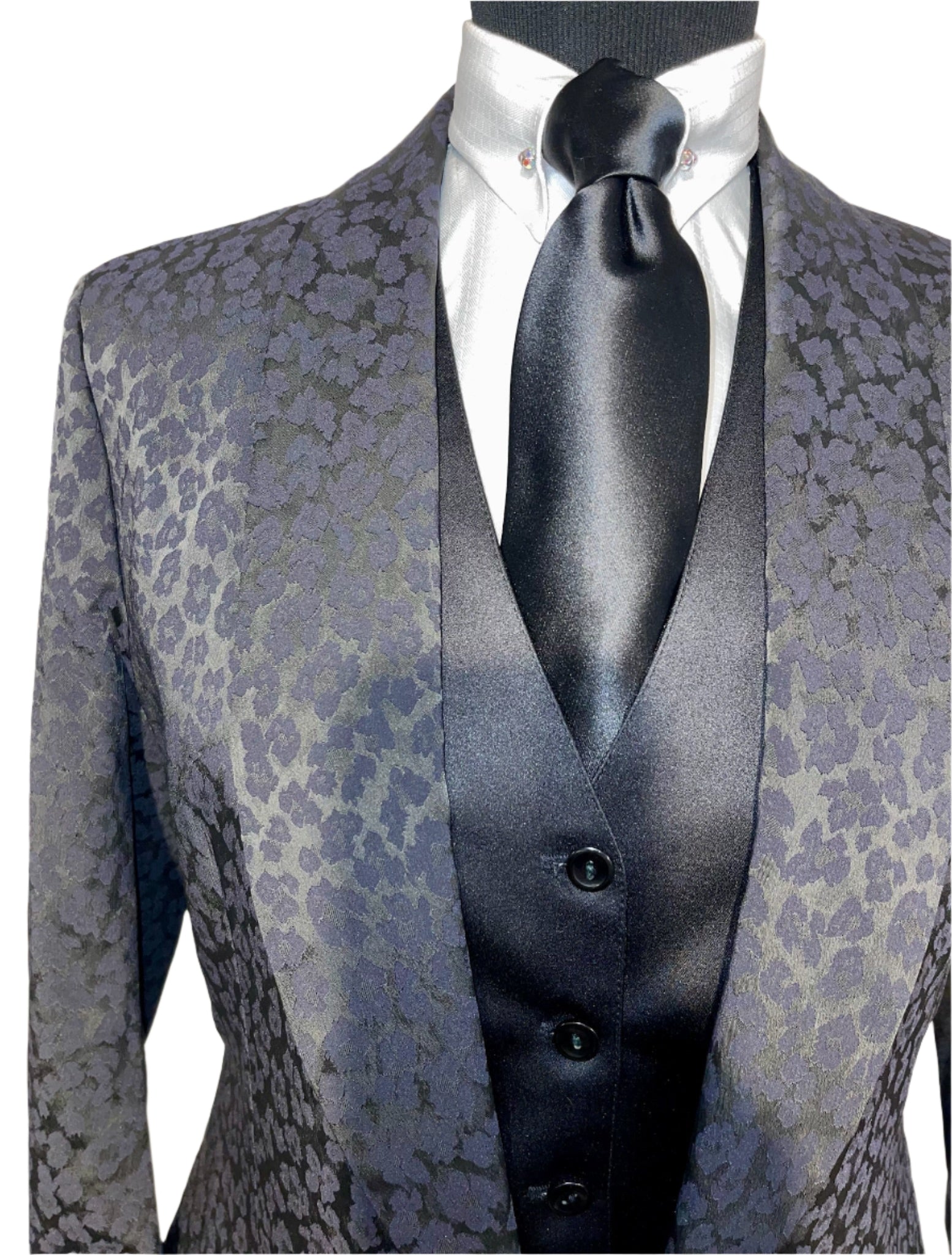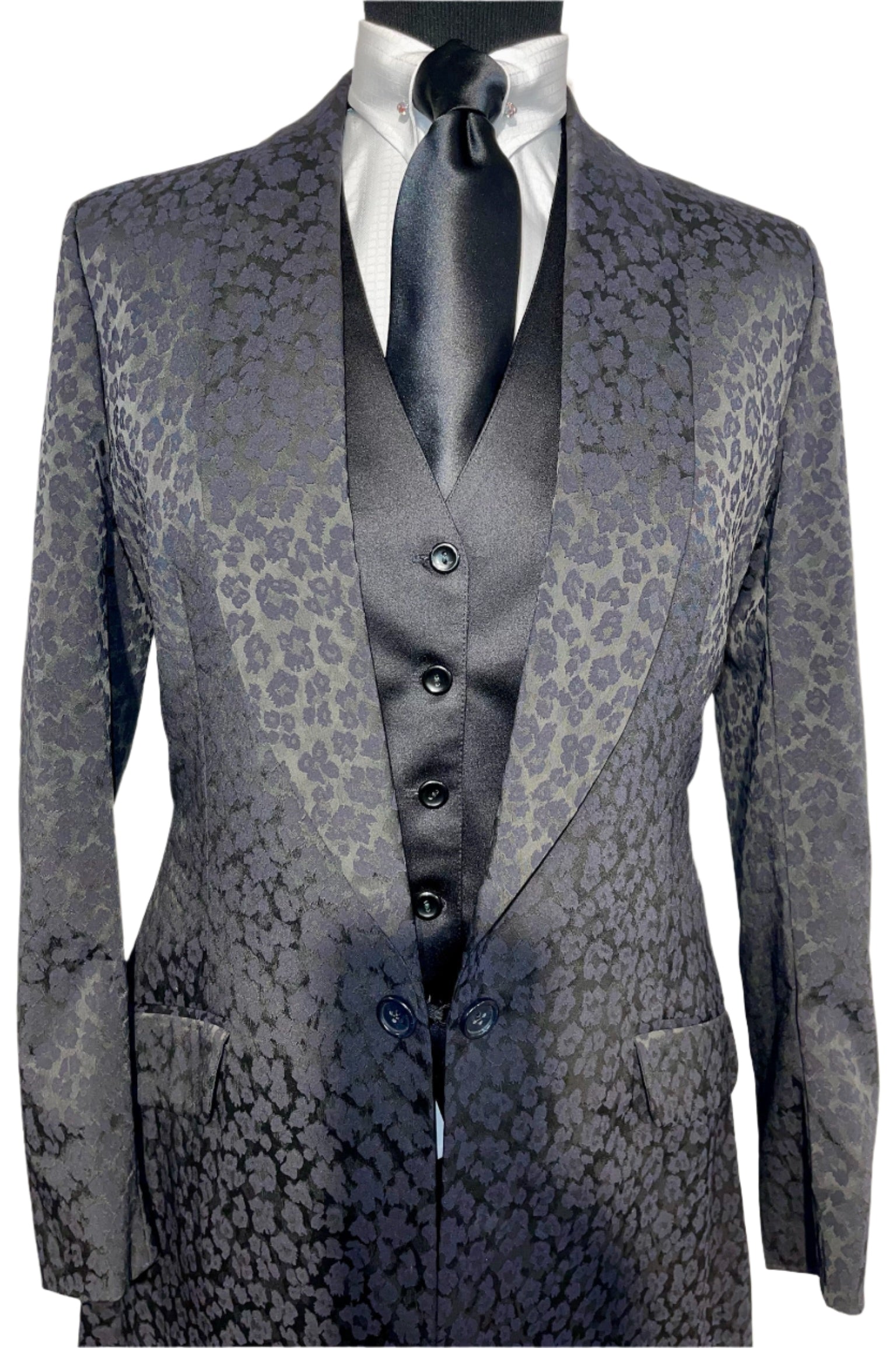 Consigned, excellent condition, black with a midnight navy cheetah print. It approximately fits a ladies size 10/12, with all the original let out remaining.