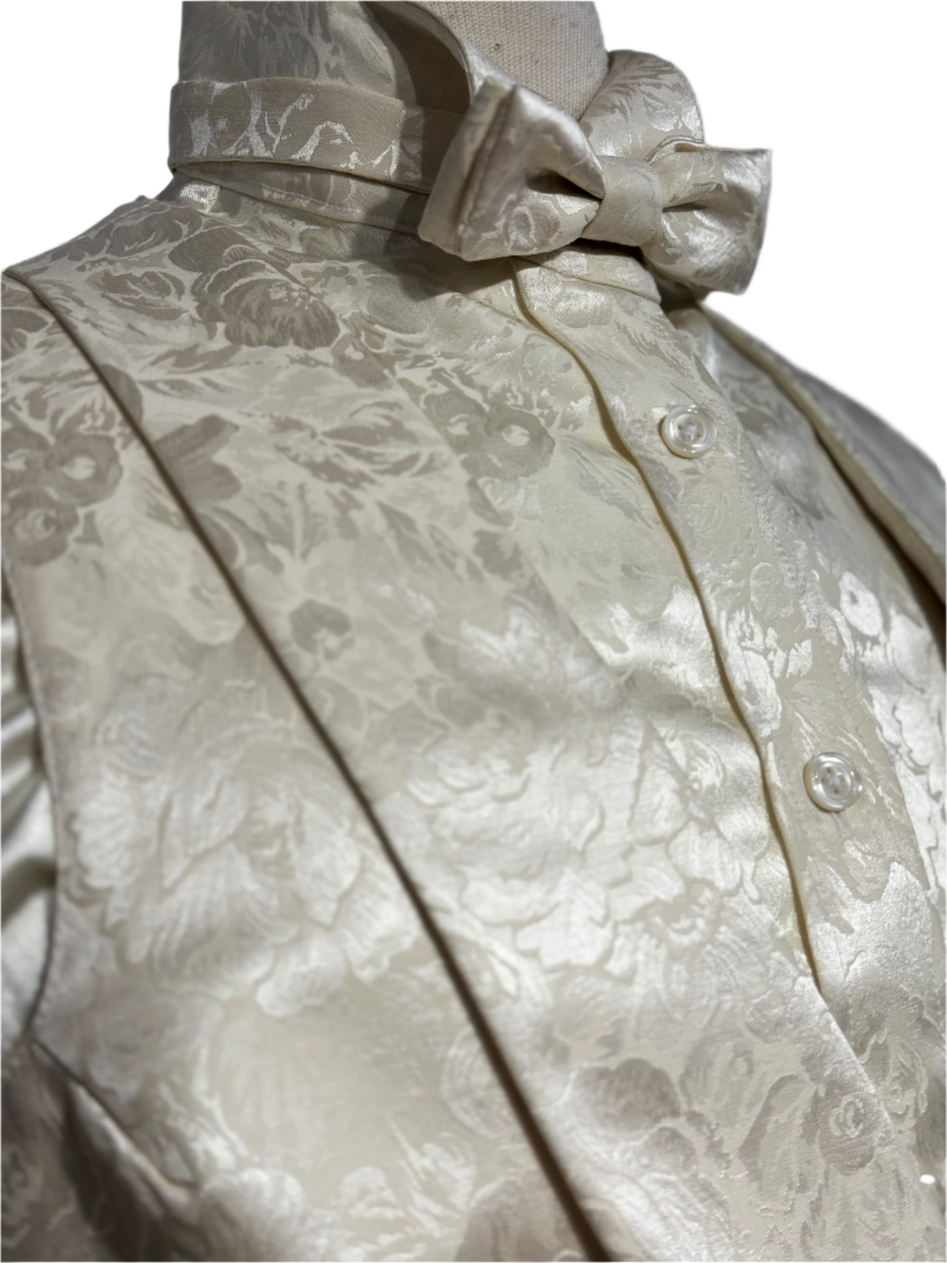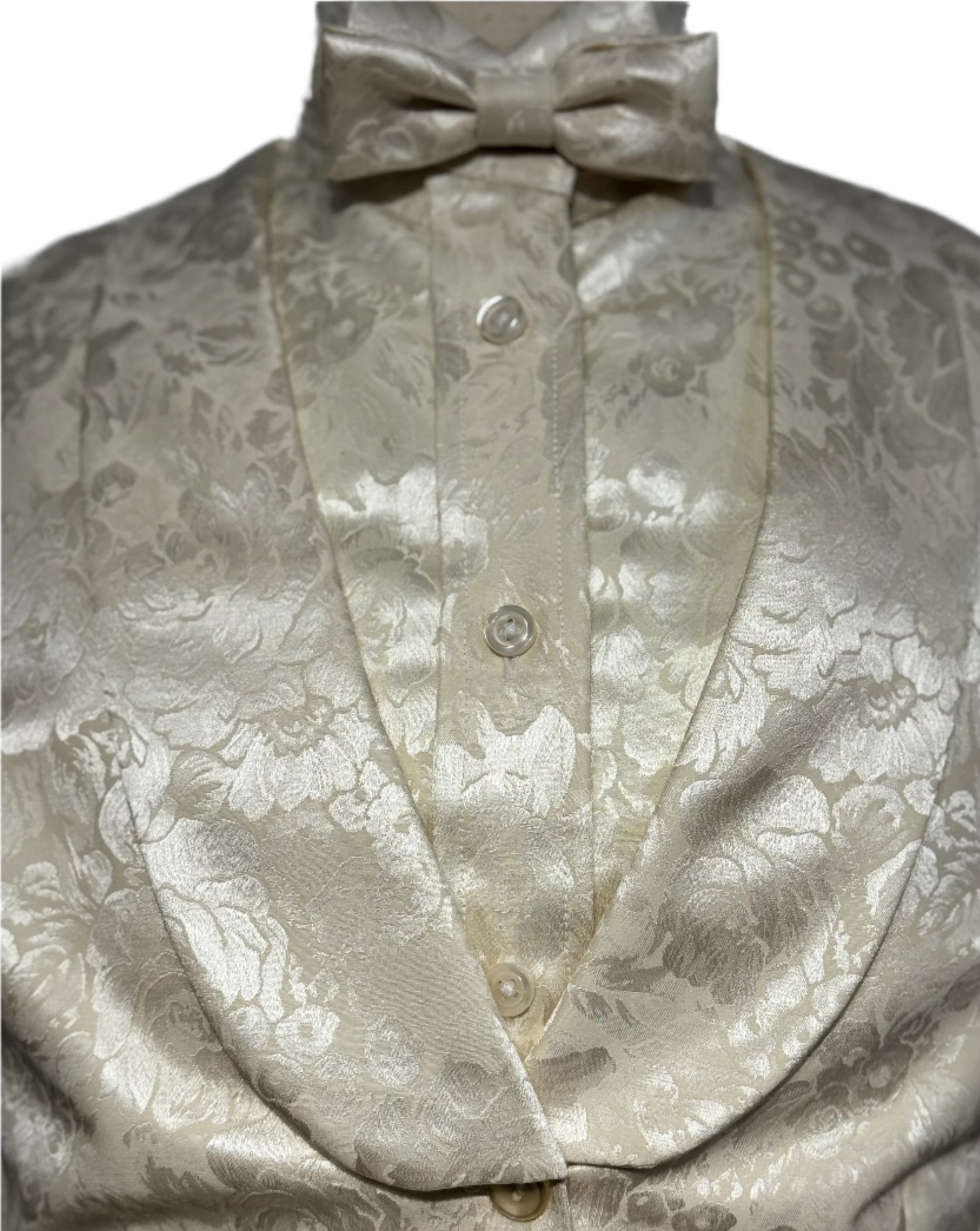 Consigned custom, never worn, cream with a large floral brocade pattern, matching bow tie .