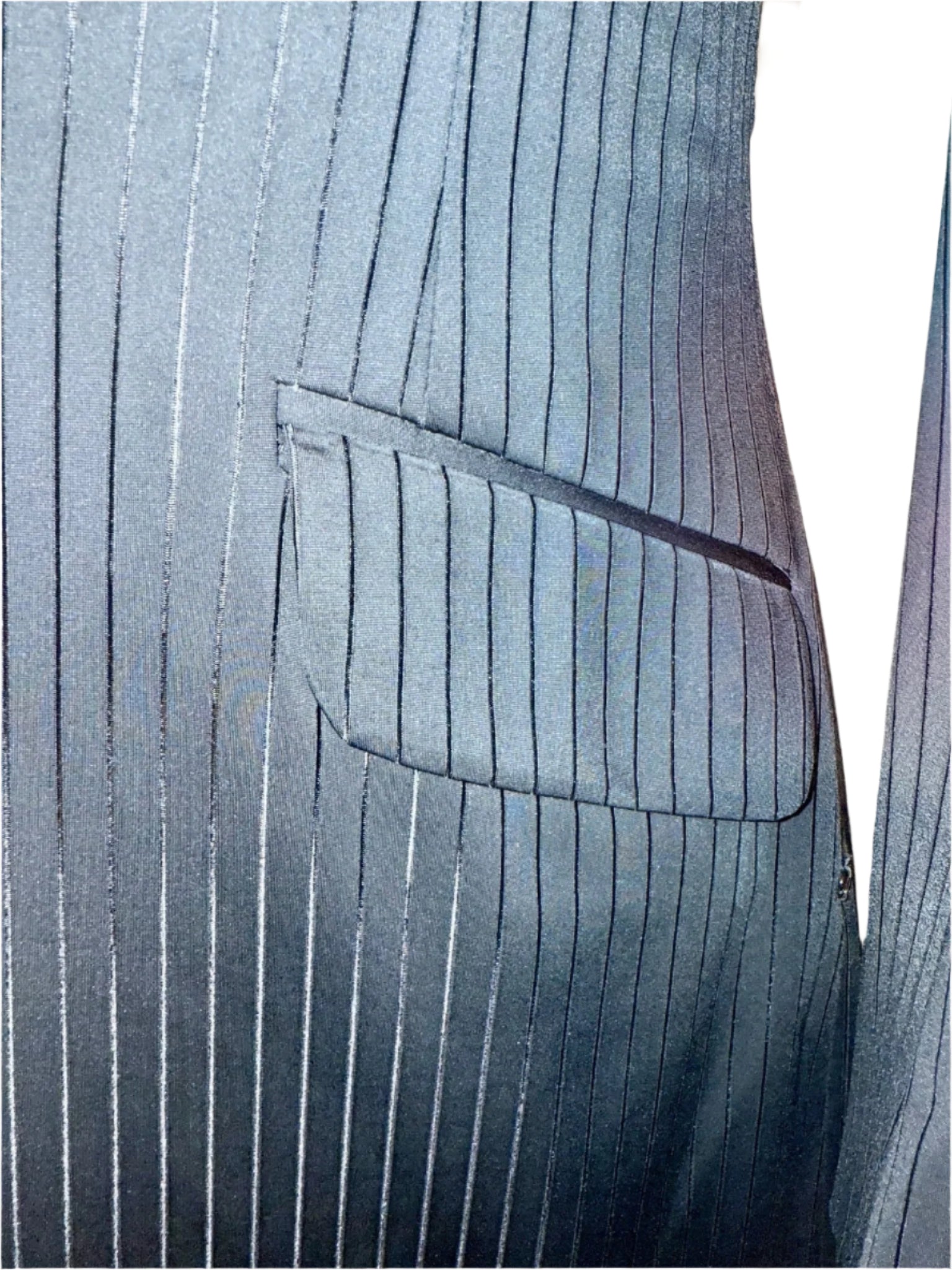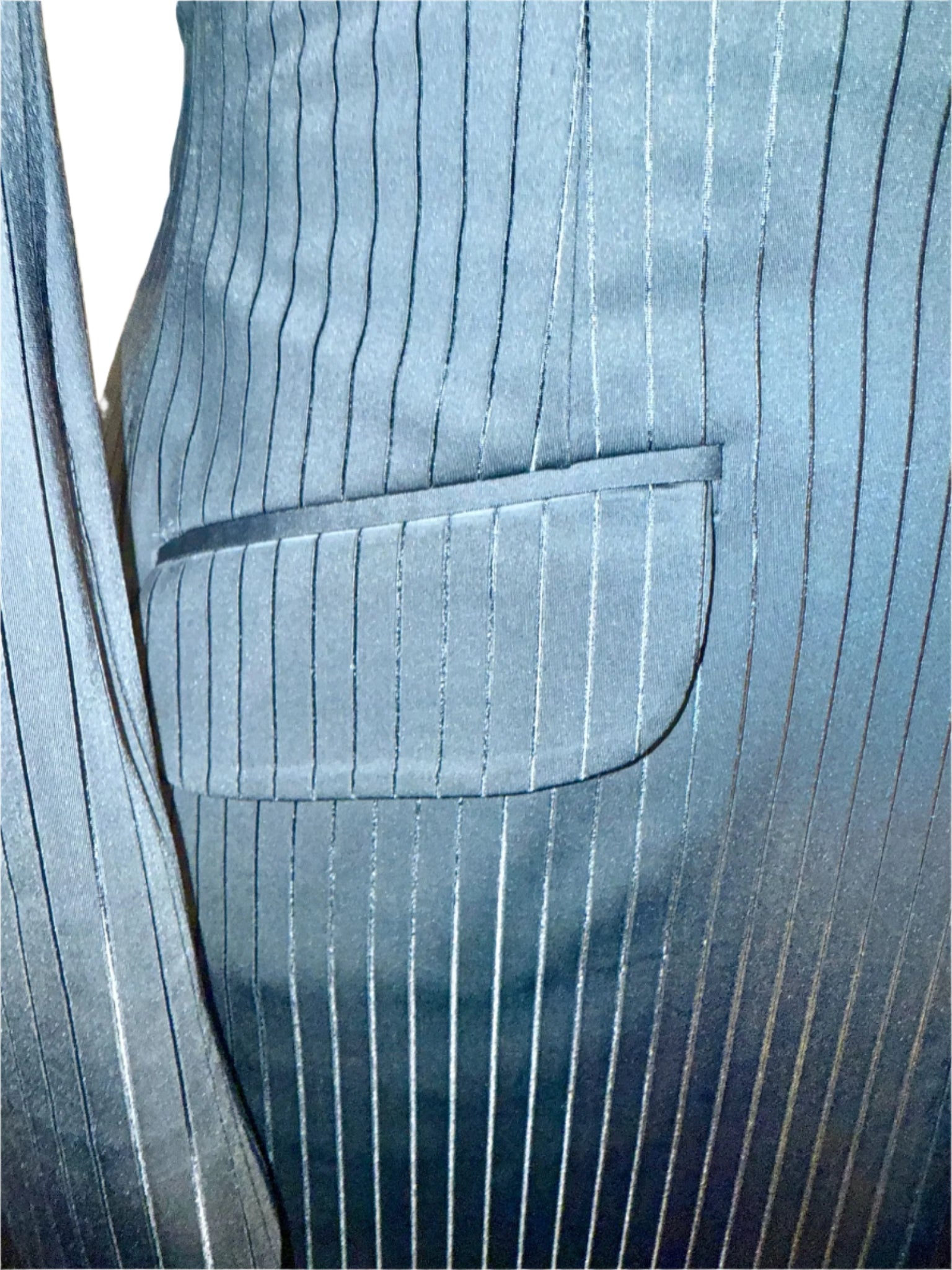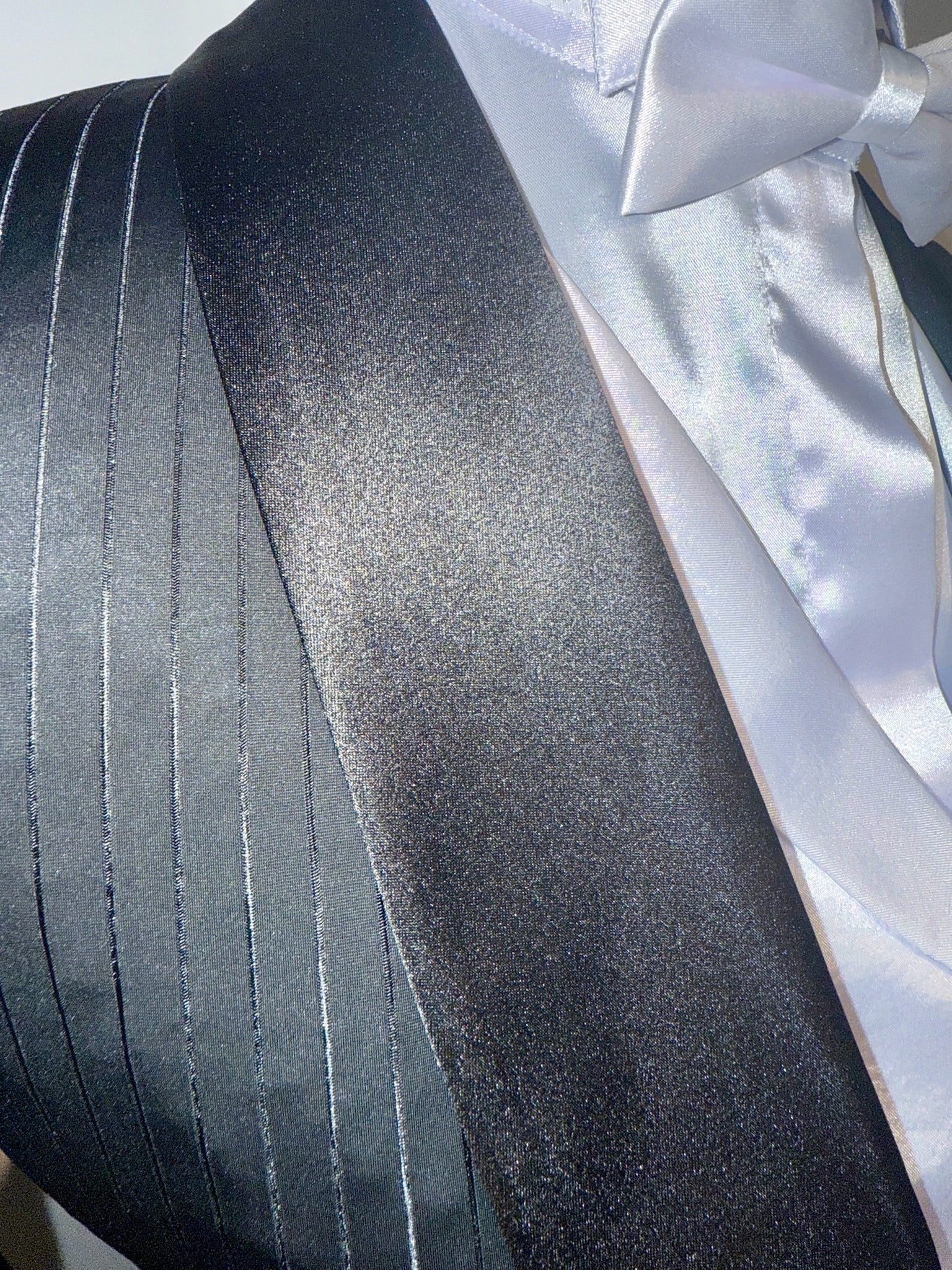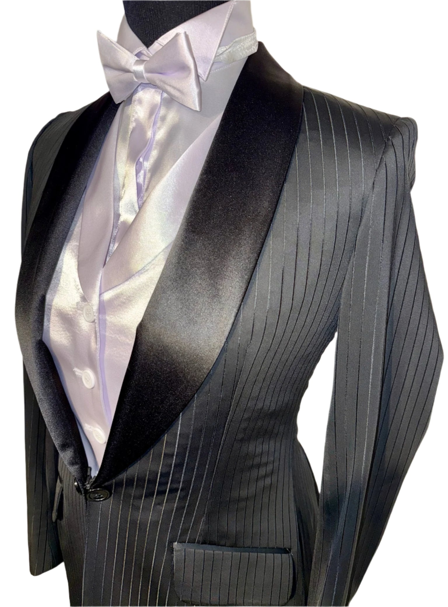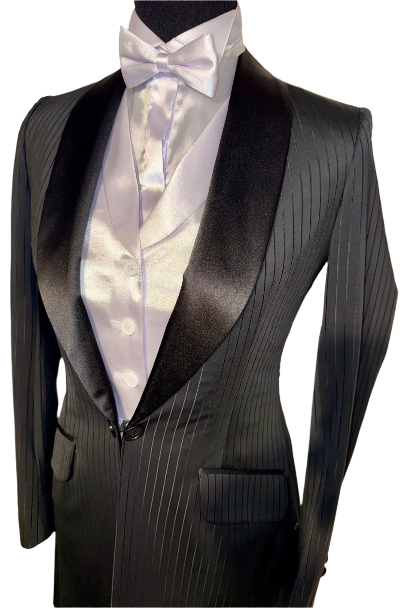 Consigned, custom 2024, black stretch formal with a tone-on-tone stripe. Really striking in person the stripe features a sheen that elongates its rider. The stretch offers a fitted look while maintaining comfort. Approximately fits a ladies size 4 petite.