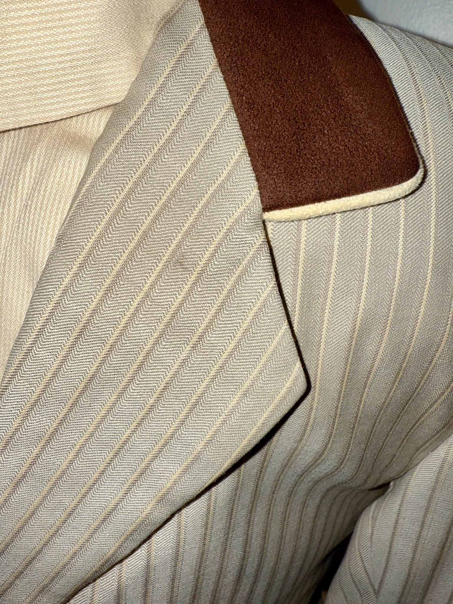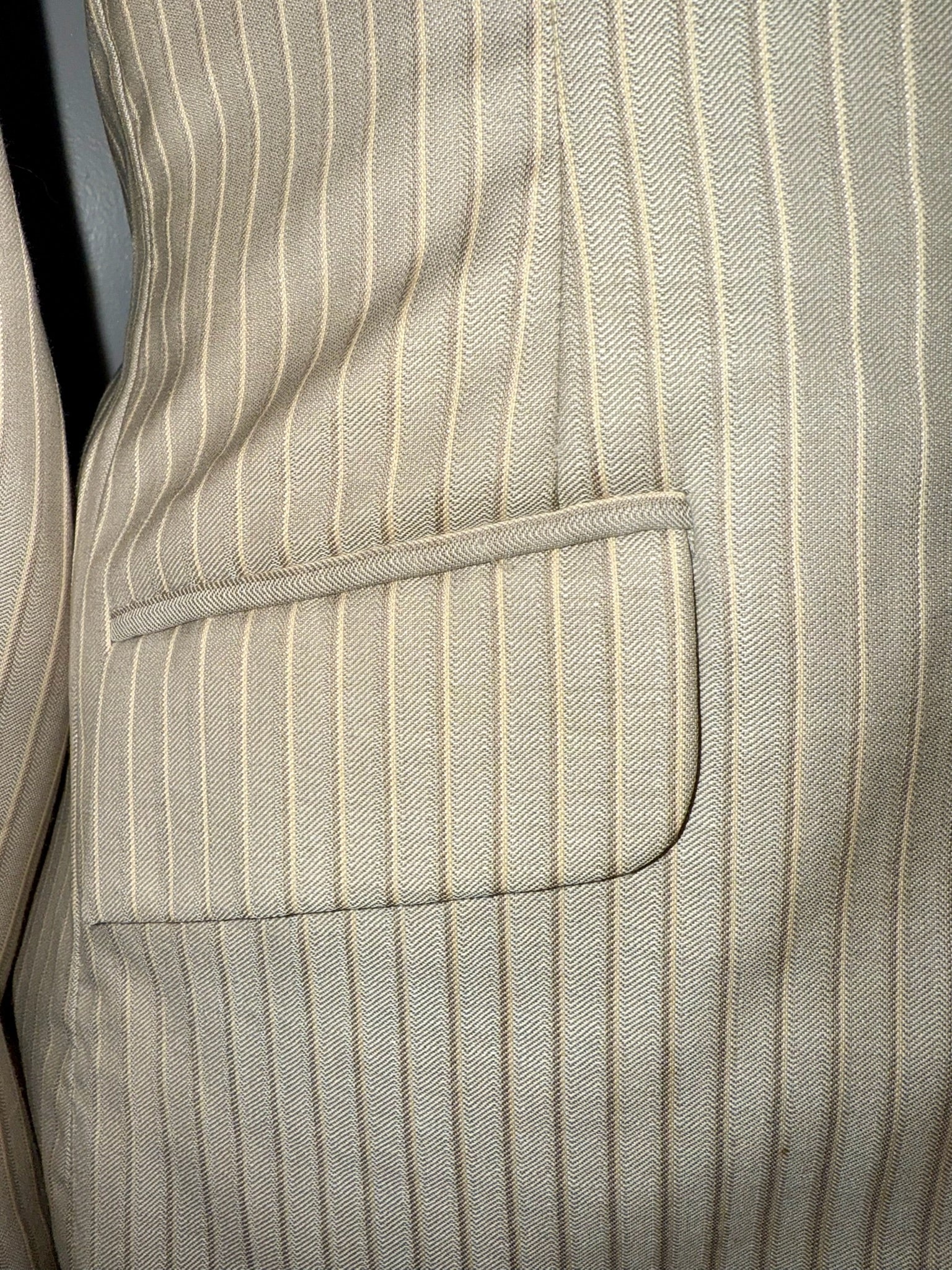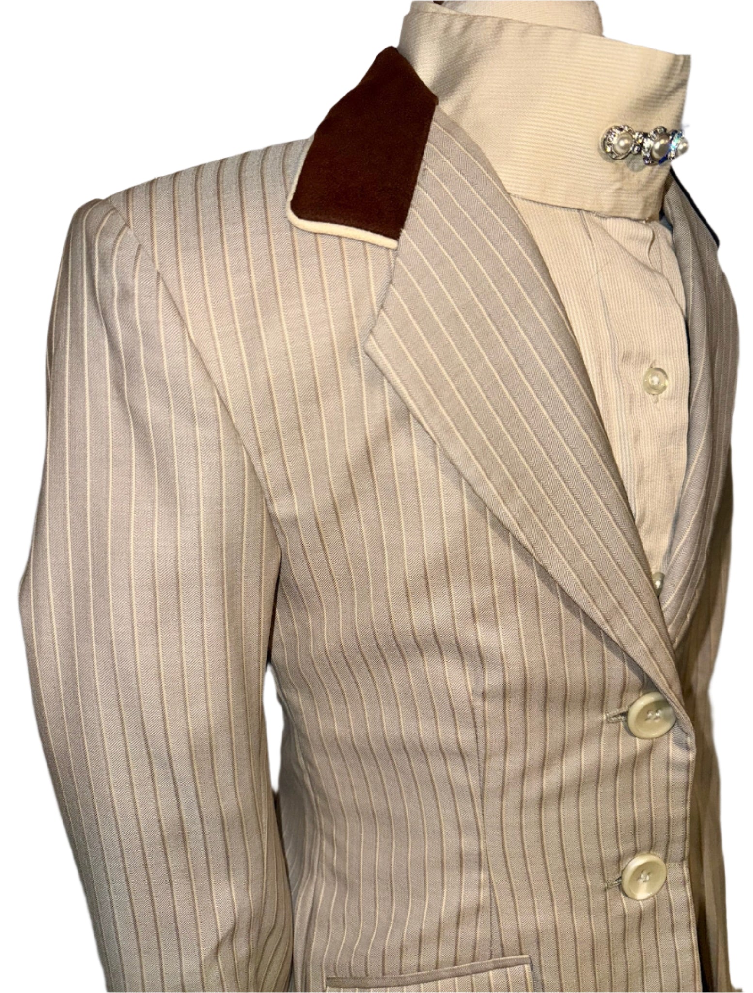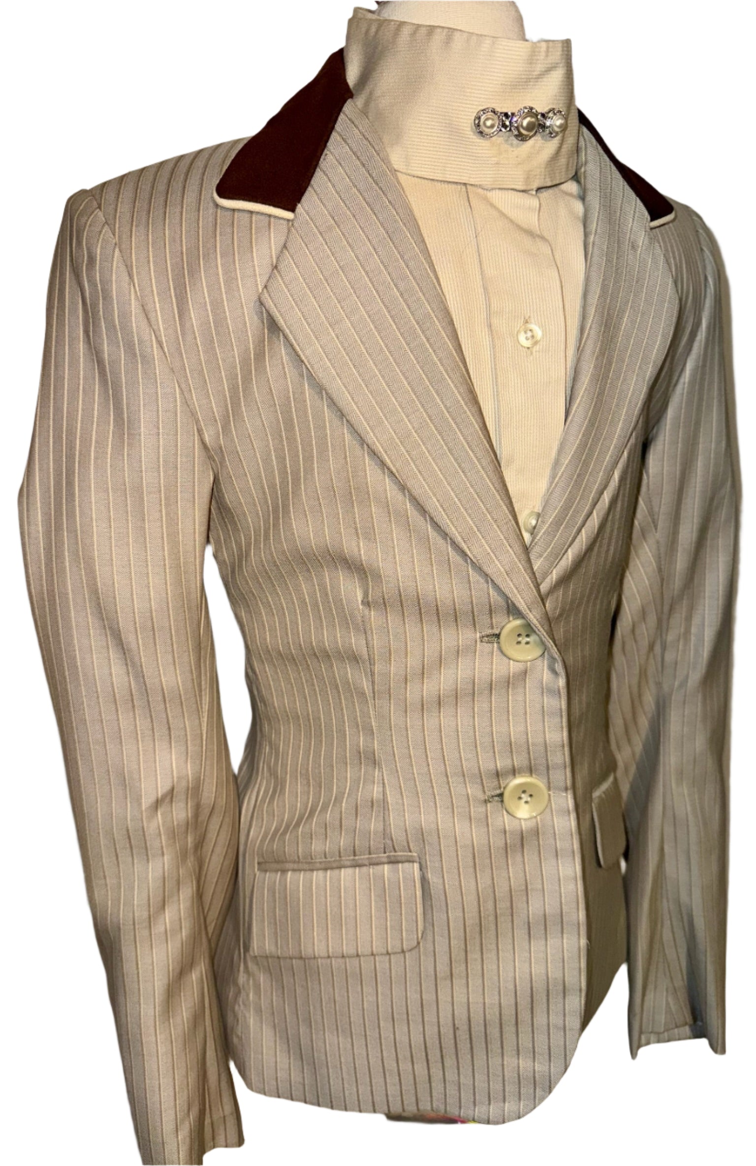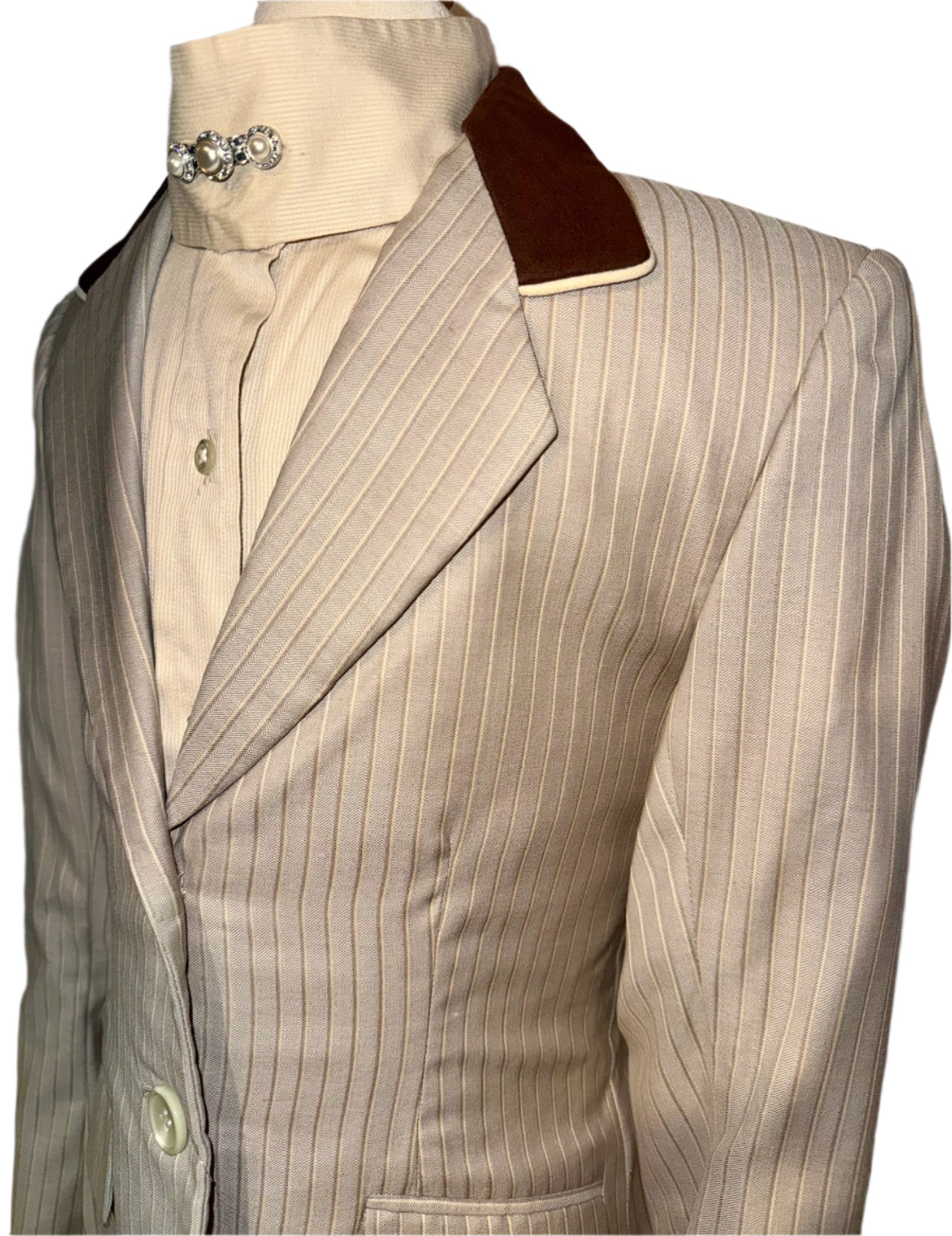 Consigned, excellent condition, stock size girl's 8, in a shade if sand and cream, with a chestnut pinstripe and collar trim. Approximately fits a girl's size 10.