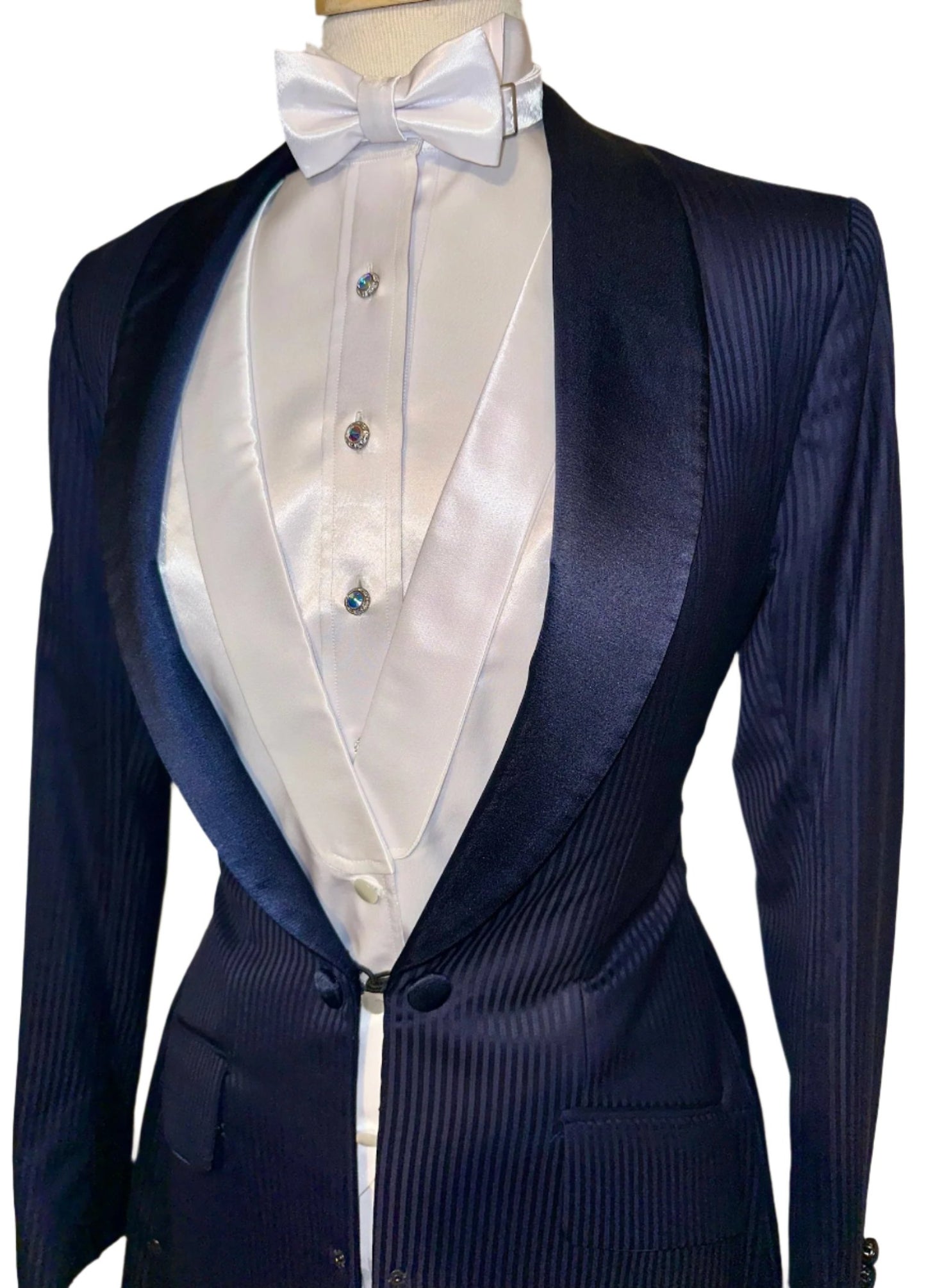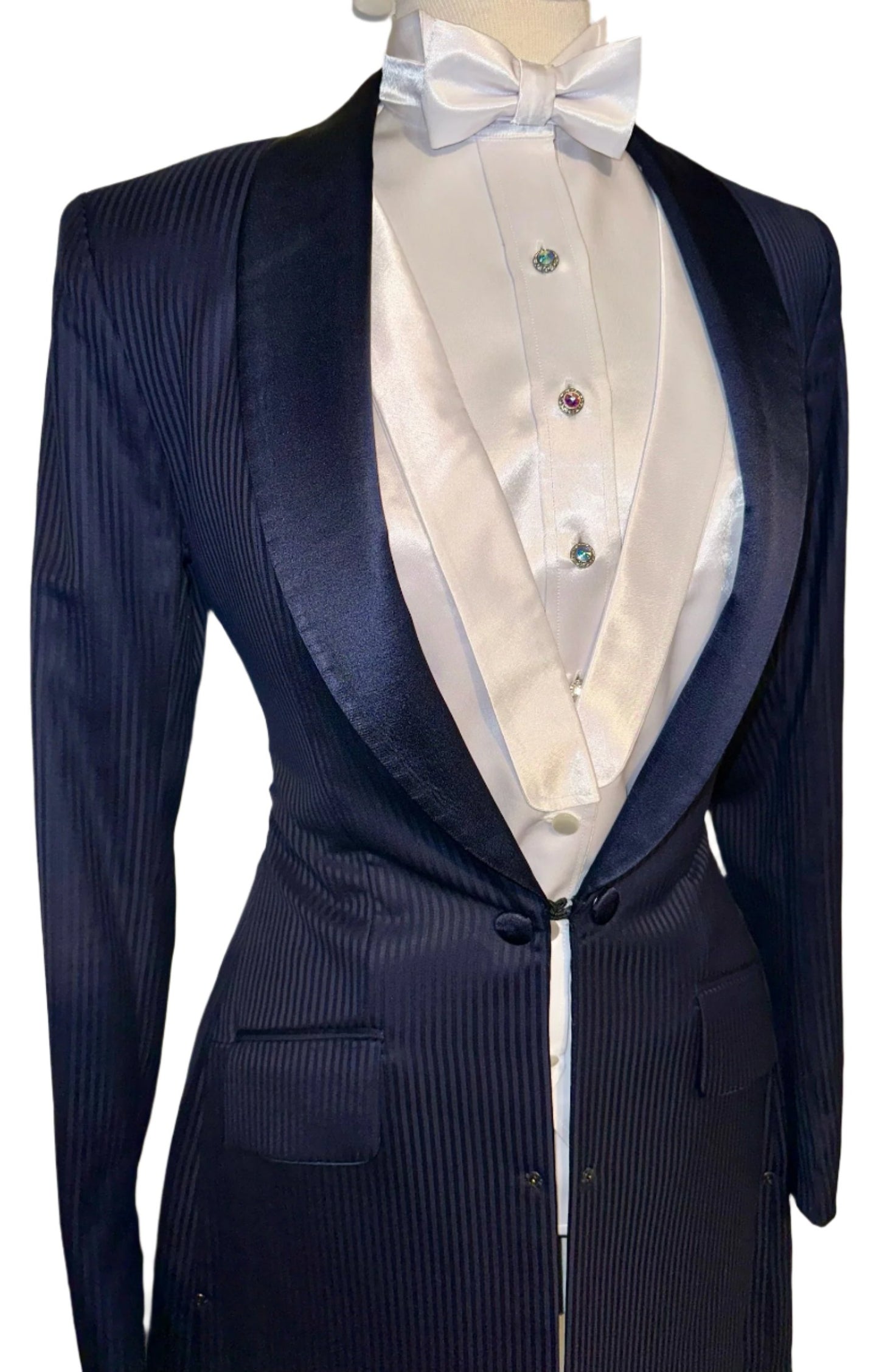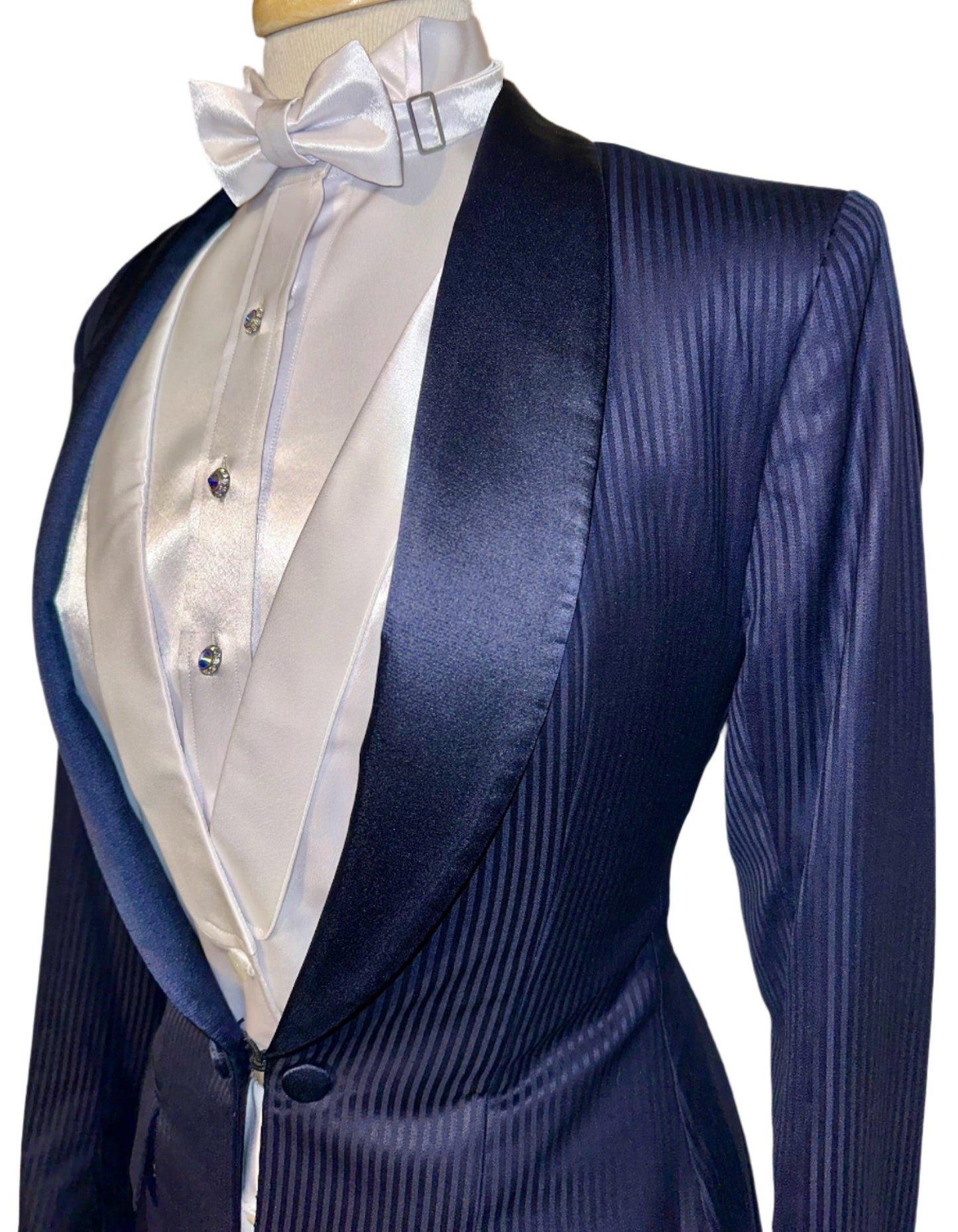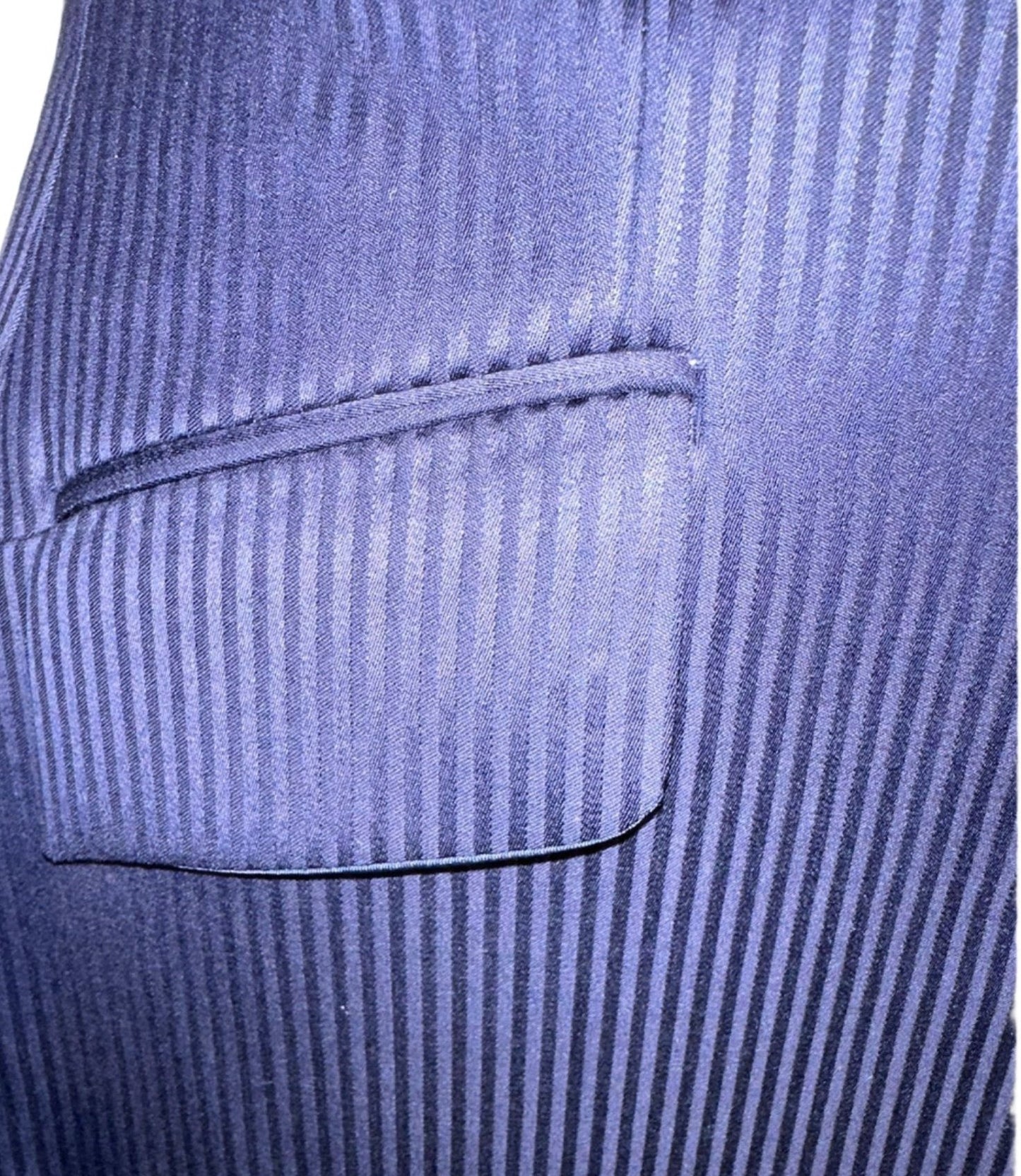 Marsha de Arriaga, ladies formal in navy with a shadow stripe pattern. Save on custom with this like-new option. Approximately fits a ladies size 4.