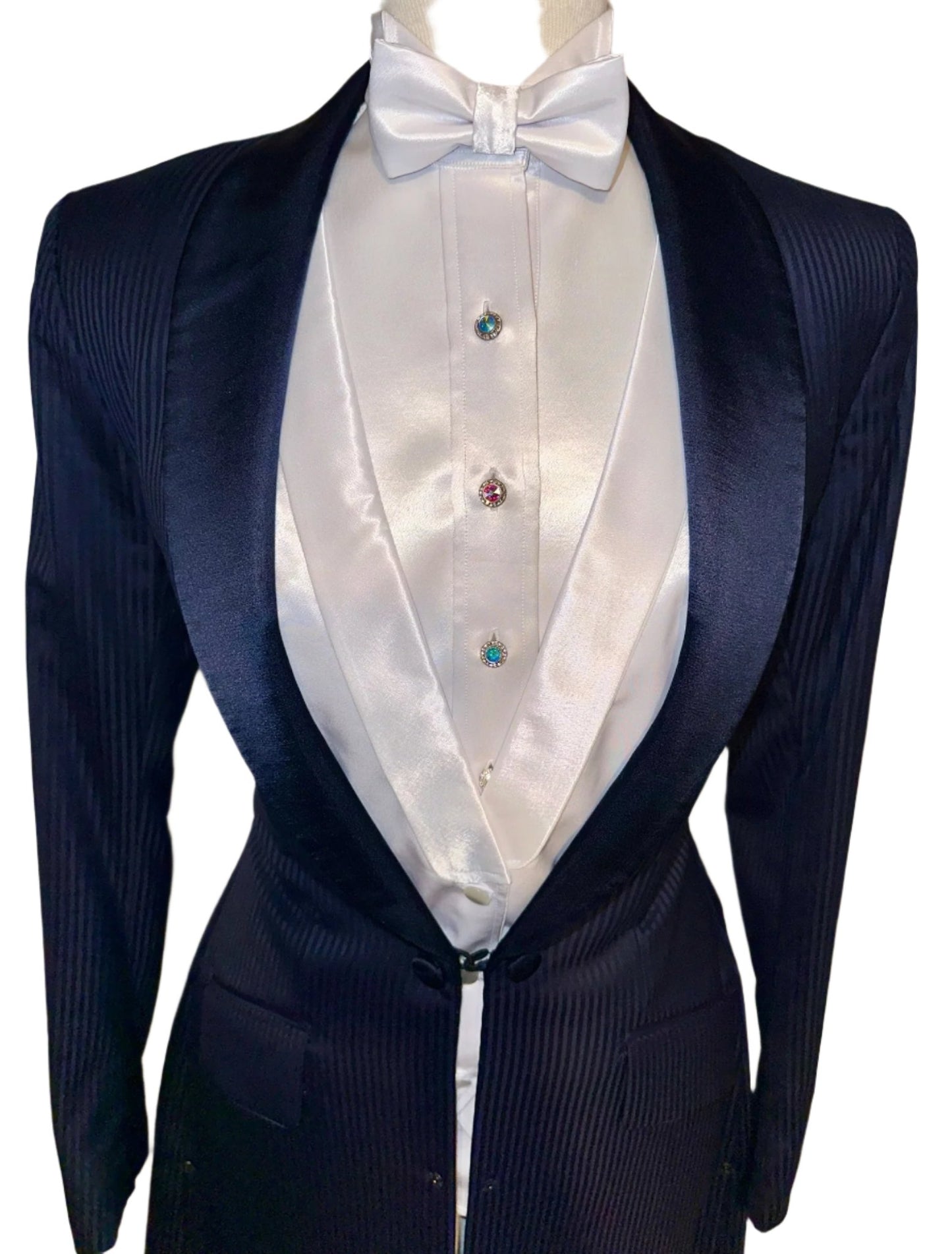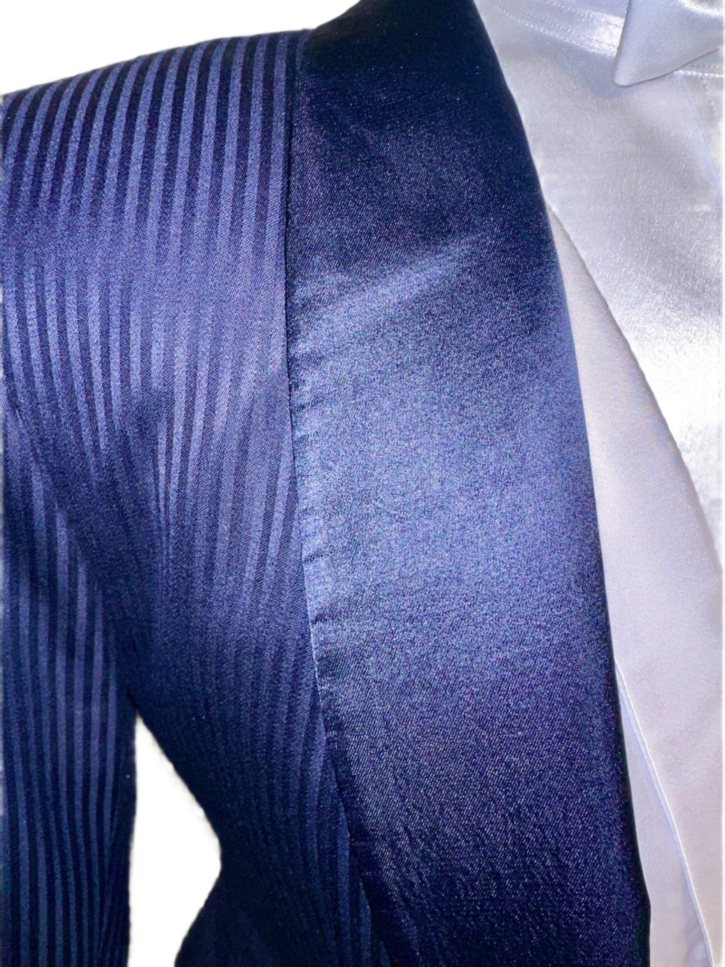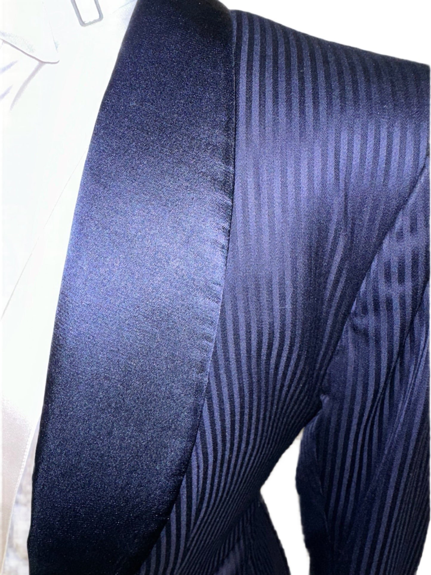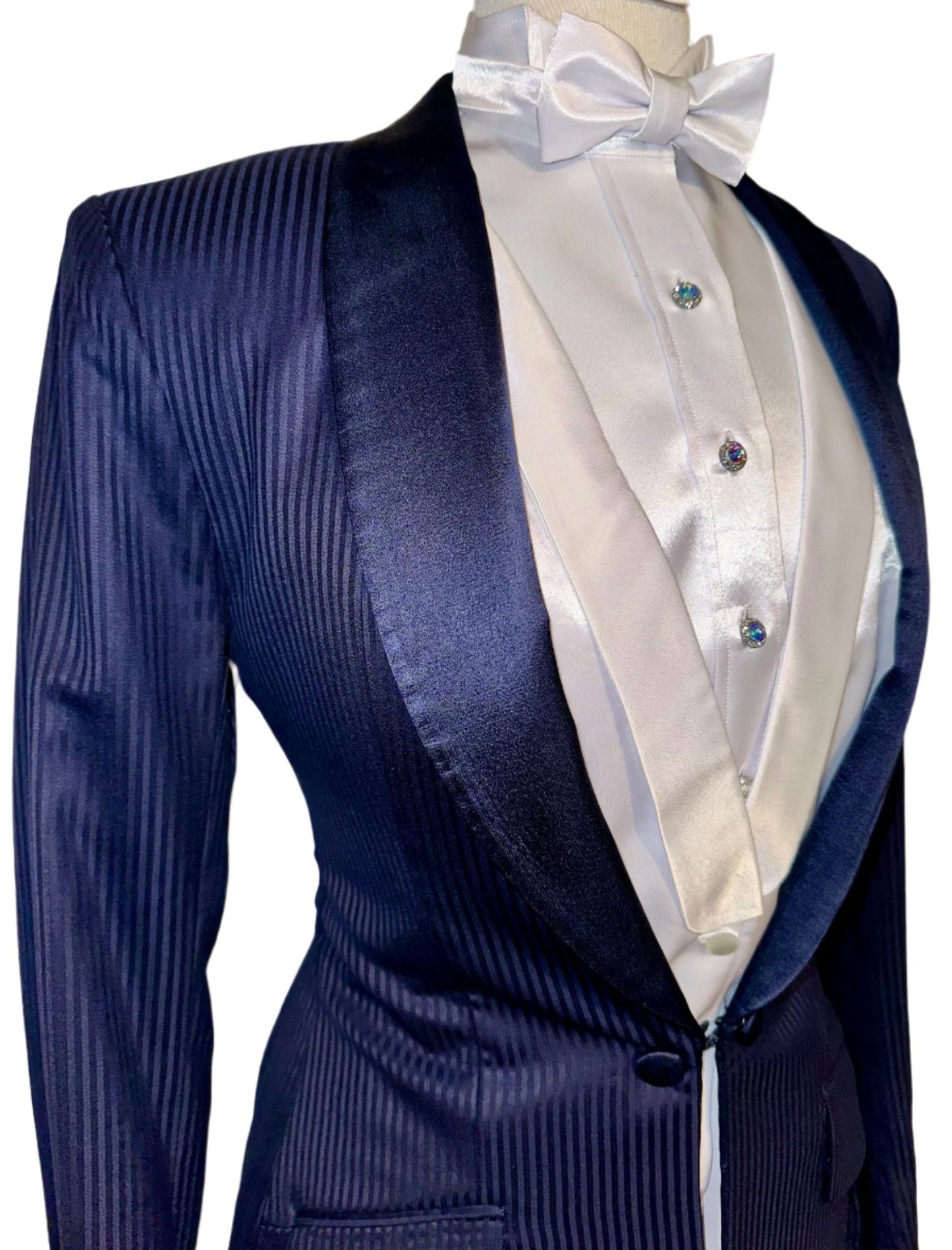 Marsha de Arriaga, ladies formal in navy with a shadow stripe pattern. Save on custom with this like-new option. Approximately fits a ladies size 4.