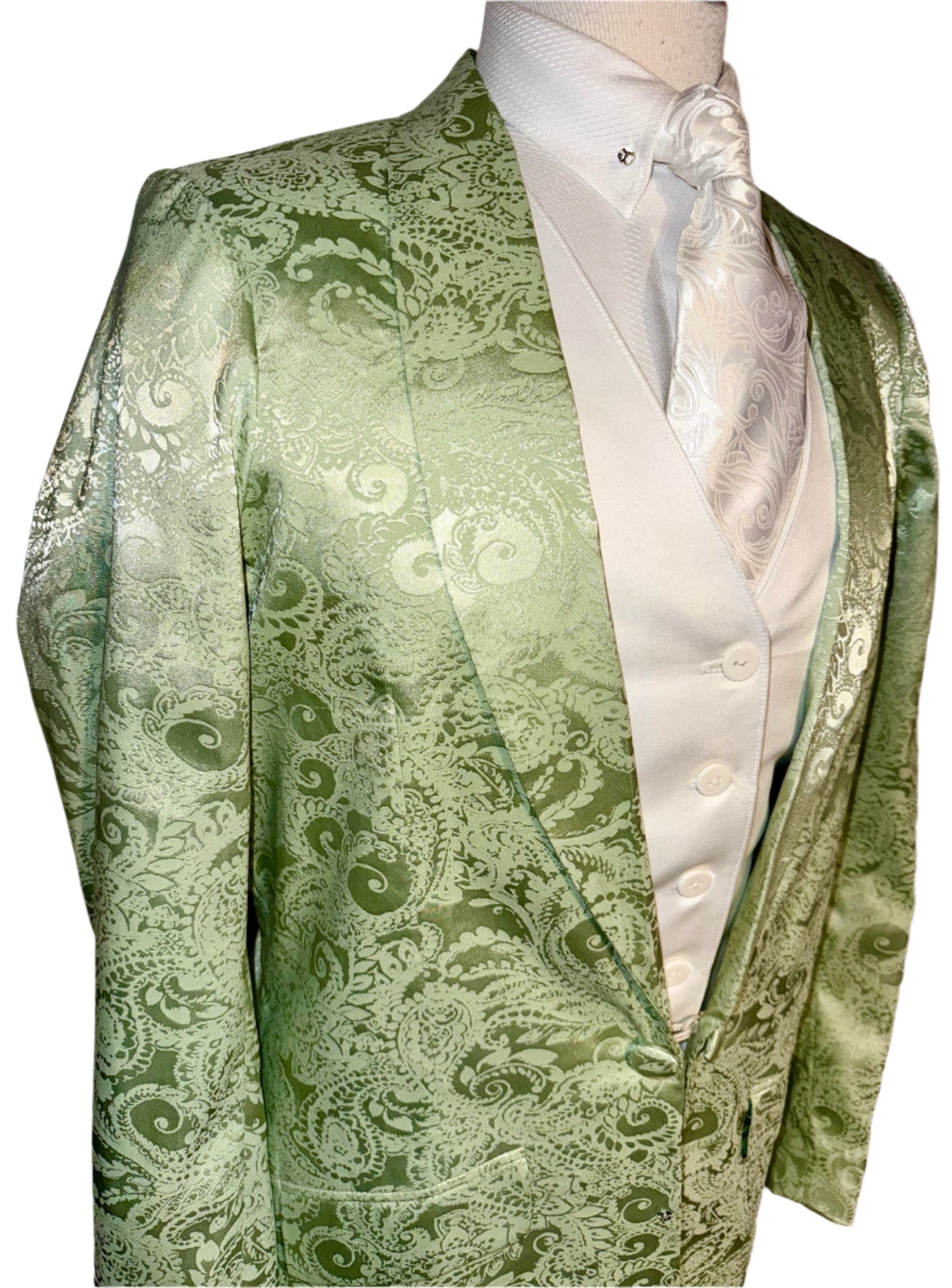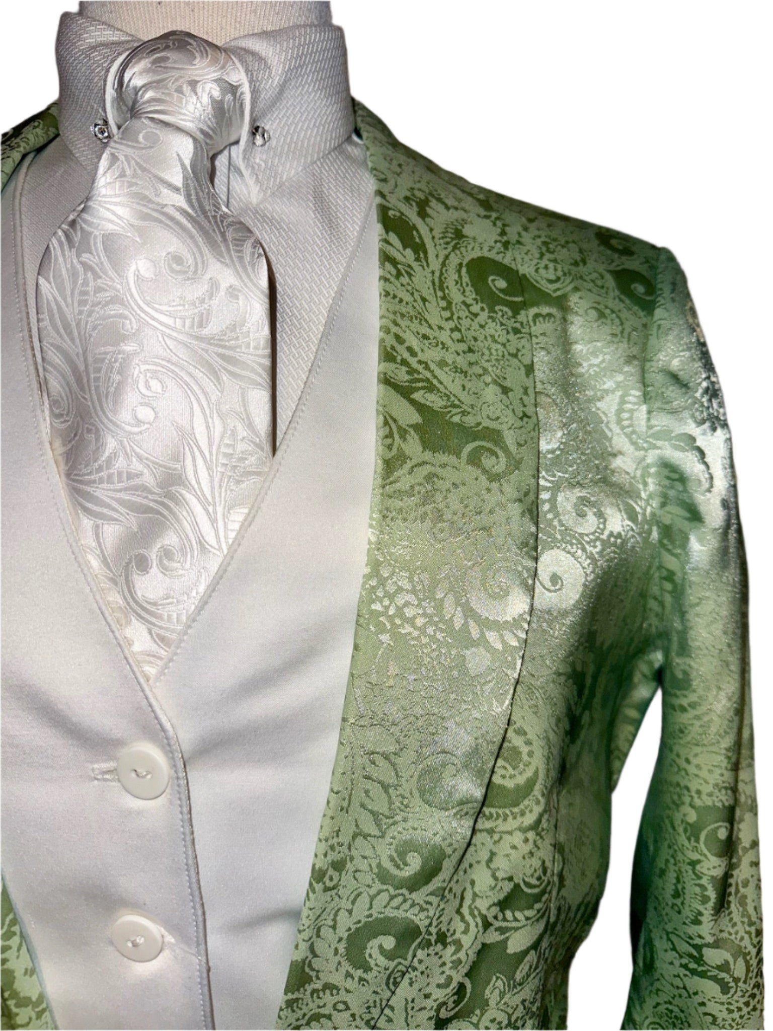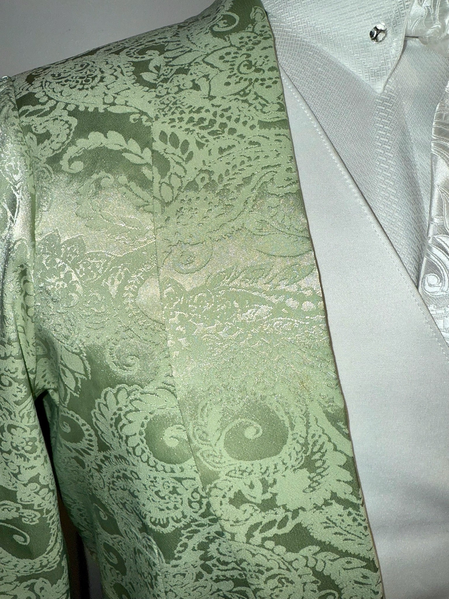 Consigned, excellent condition, pastel green brocade. Approximately fits a ladies 10, with lots of additional let out throughout.