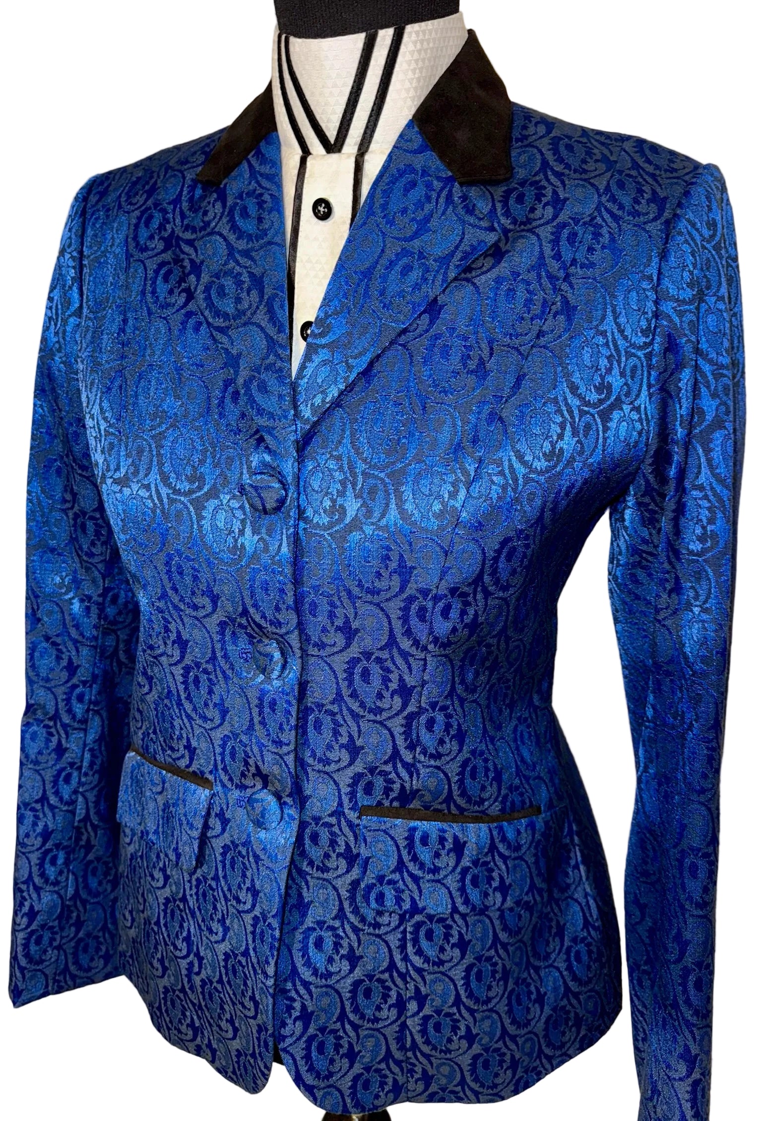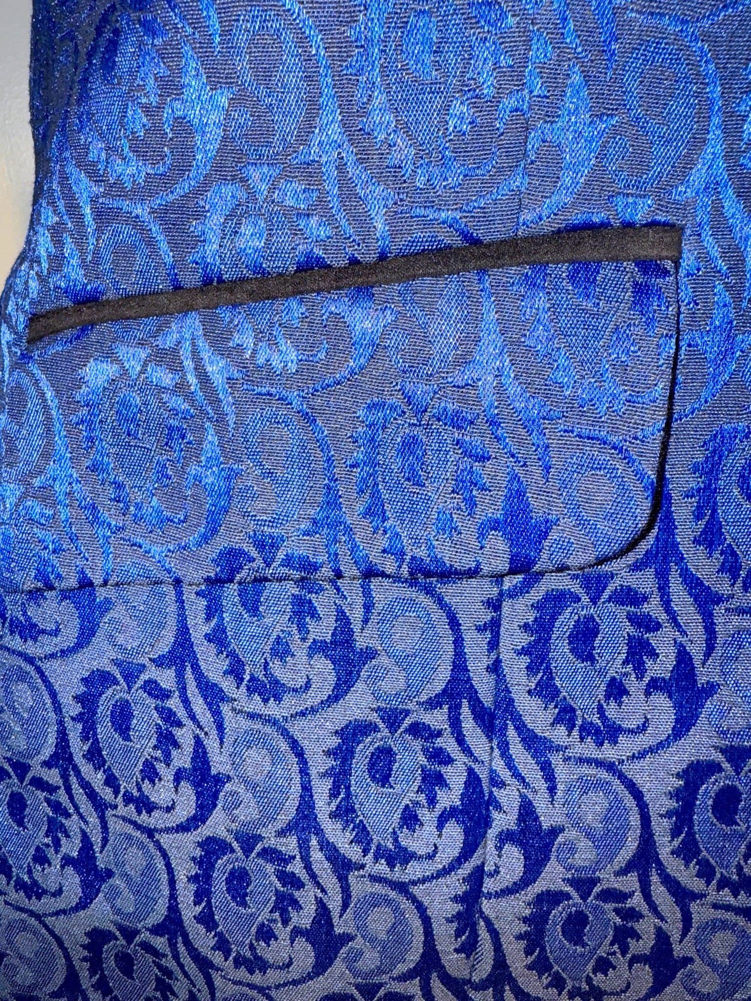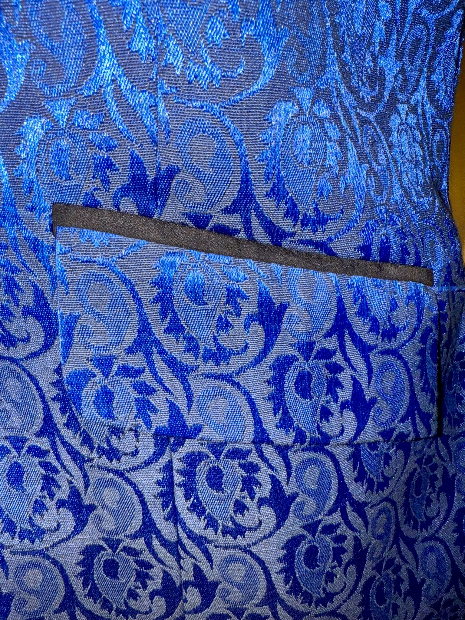 Royal blue brocade with black trim, approximately fits a ladies size 8.