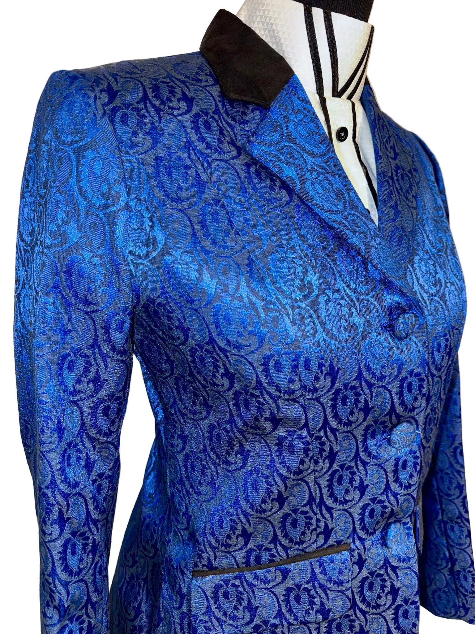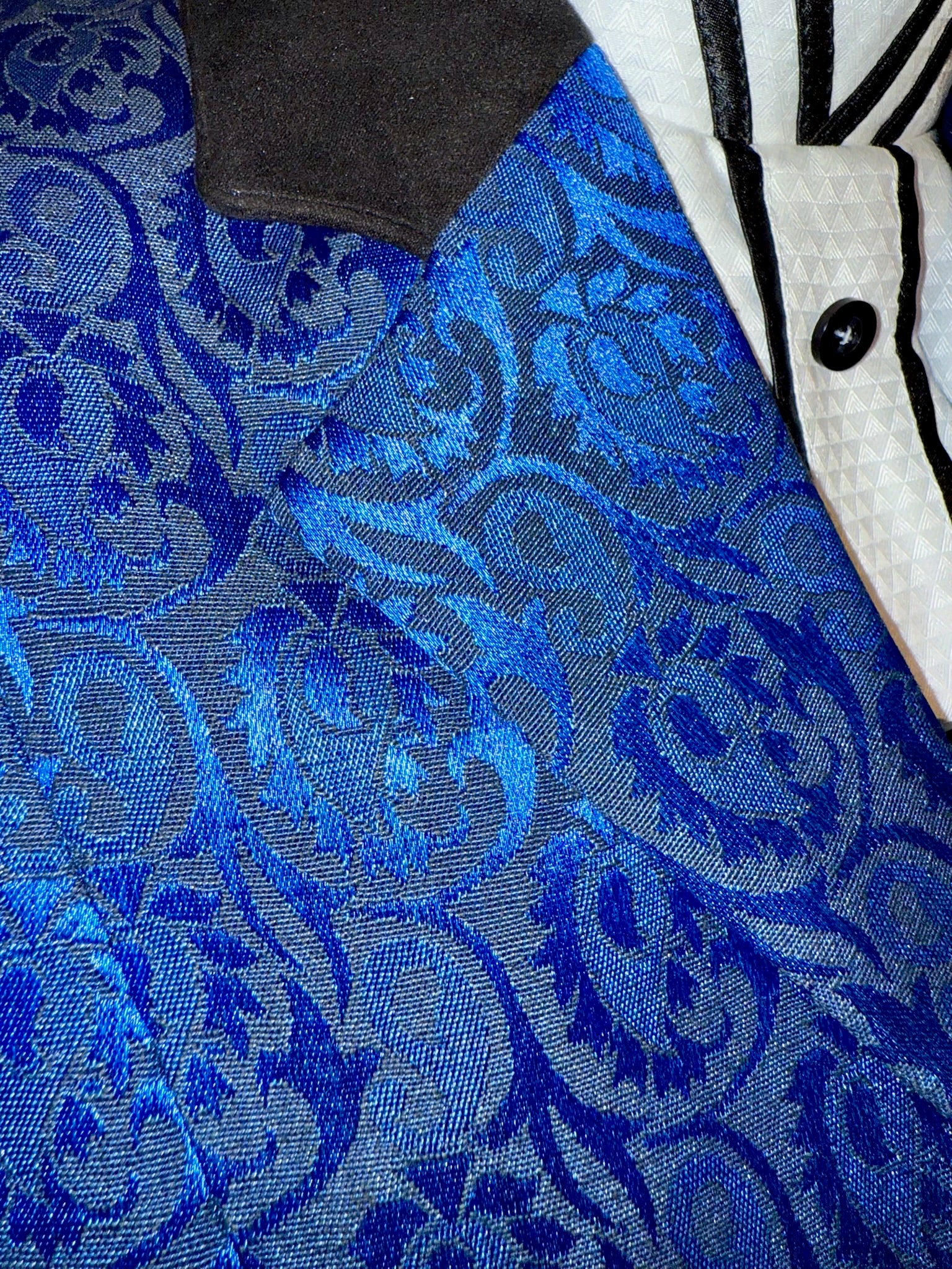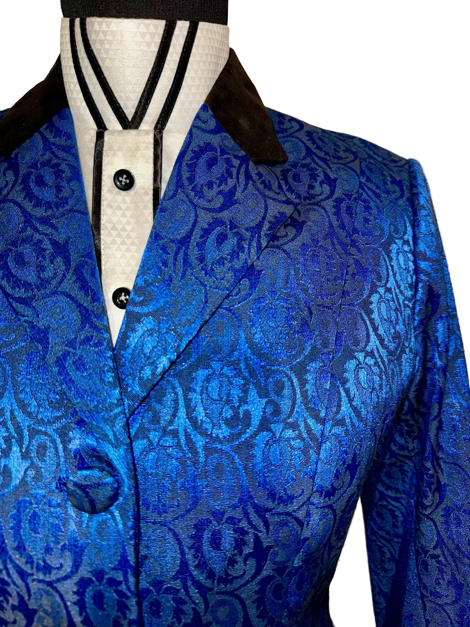 Royal blue brocade with black trim, approximately fits a ladies size 8.