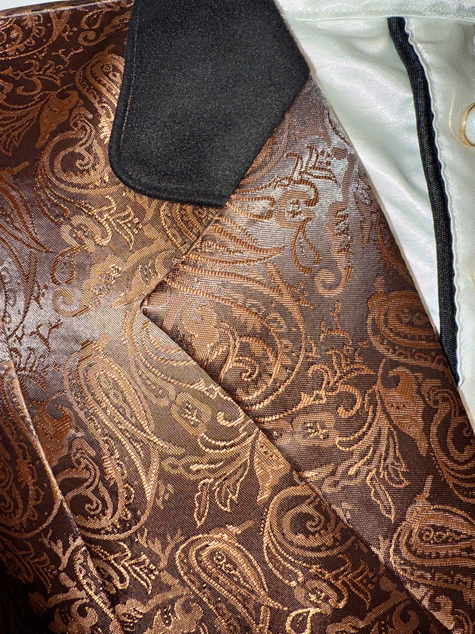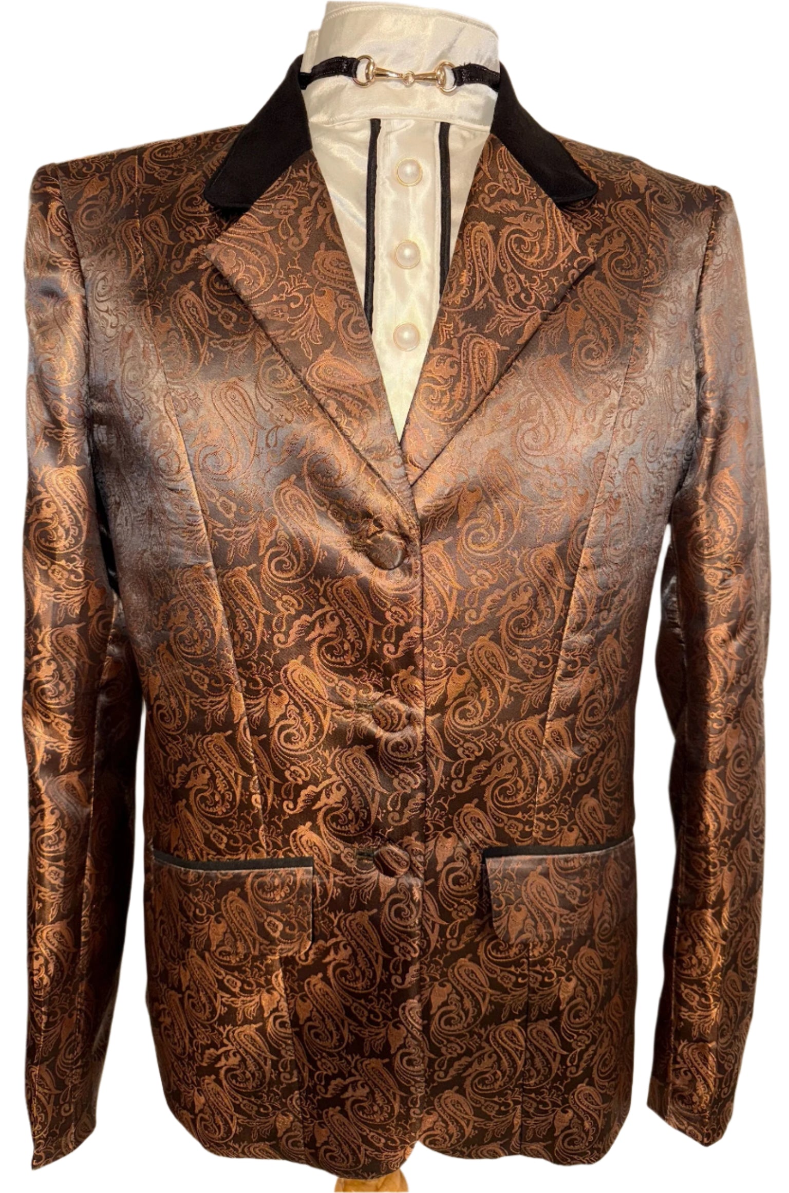 New, ladies hunt coat in a bronze paisley fabric. Approximately fits a ladies 14/16.