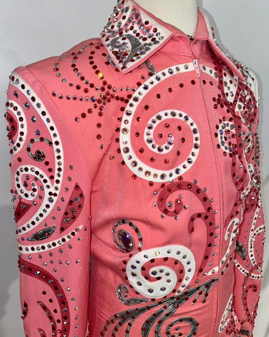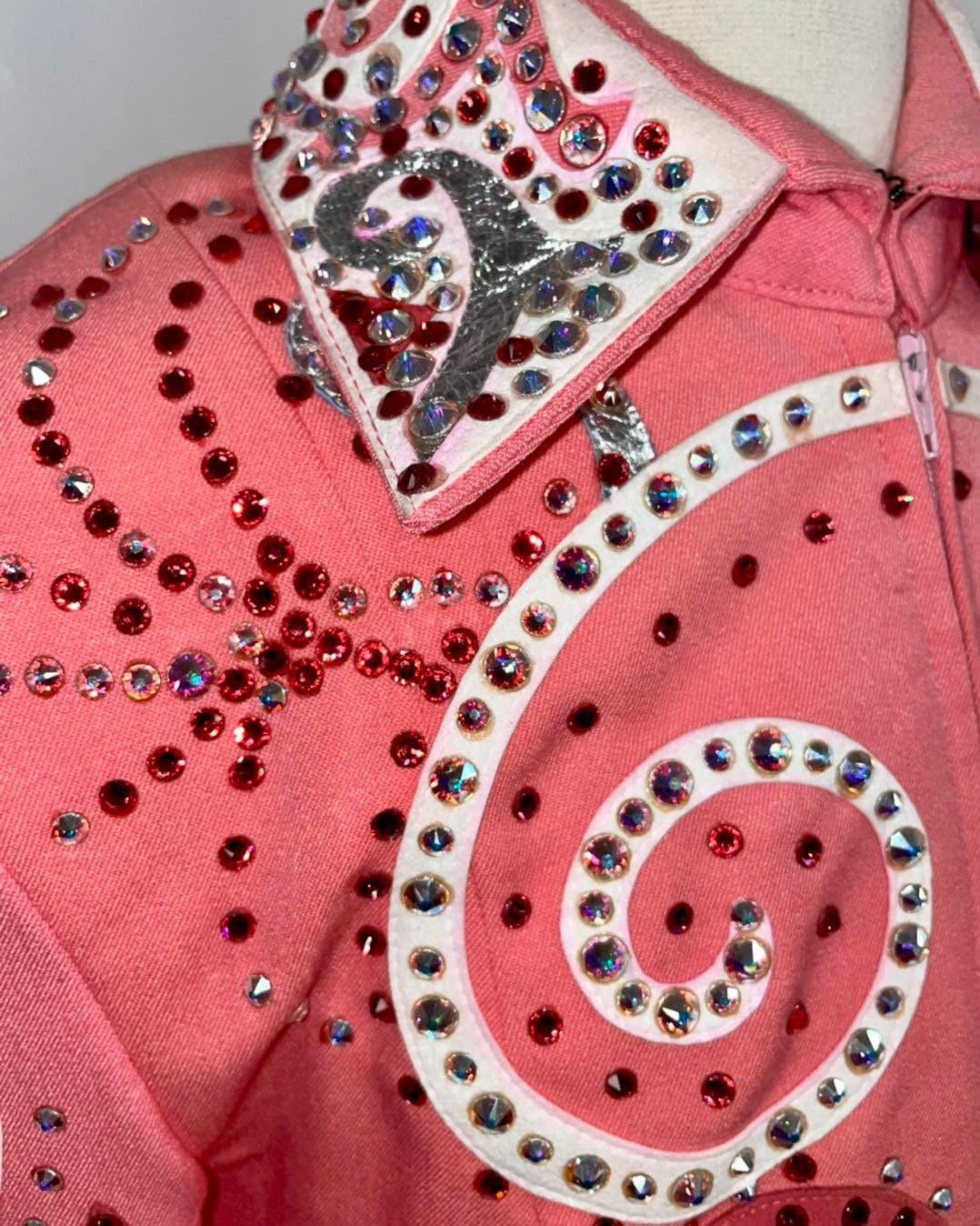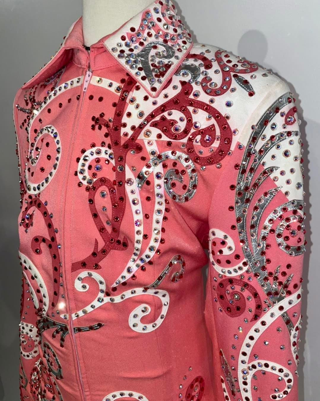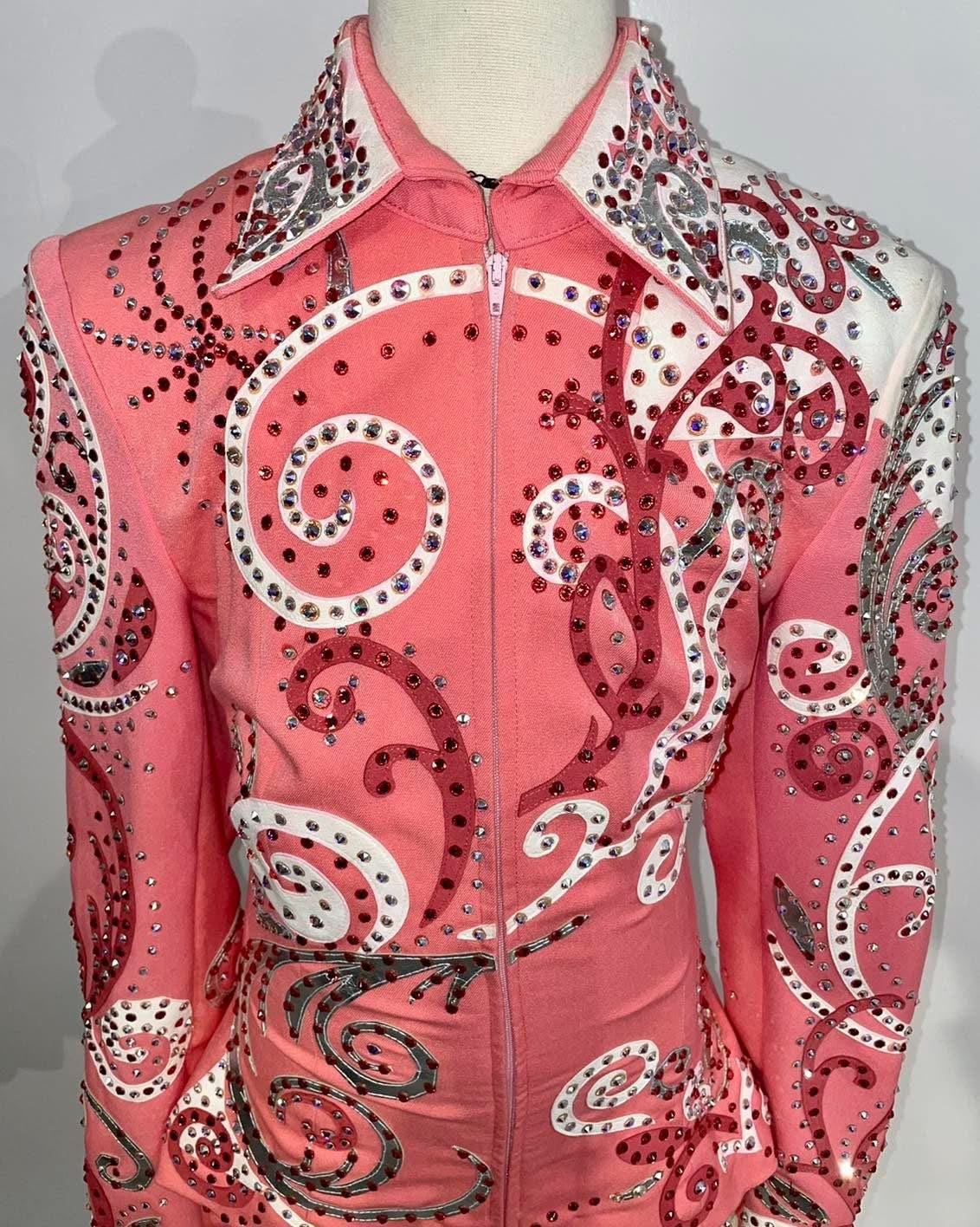 Hawkewood, girl’s/teen western set in salmon pink with silver and white trim with some stretch. This three piece set includes the jack, ultra suede chaps and pants. This option was only worn a handful of times and is in like-new condition. Approximately fits a girl’s size 12 and can go up or down a size. Asking $1,200.
