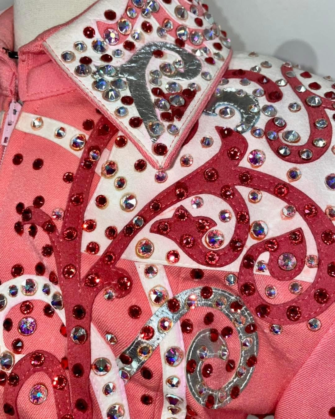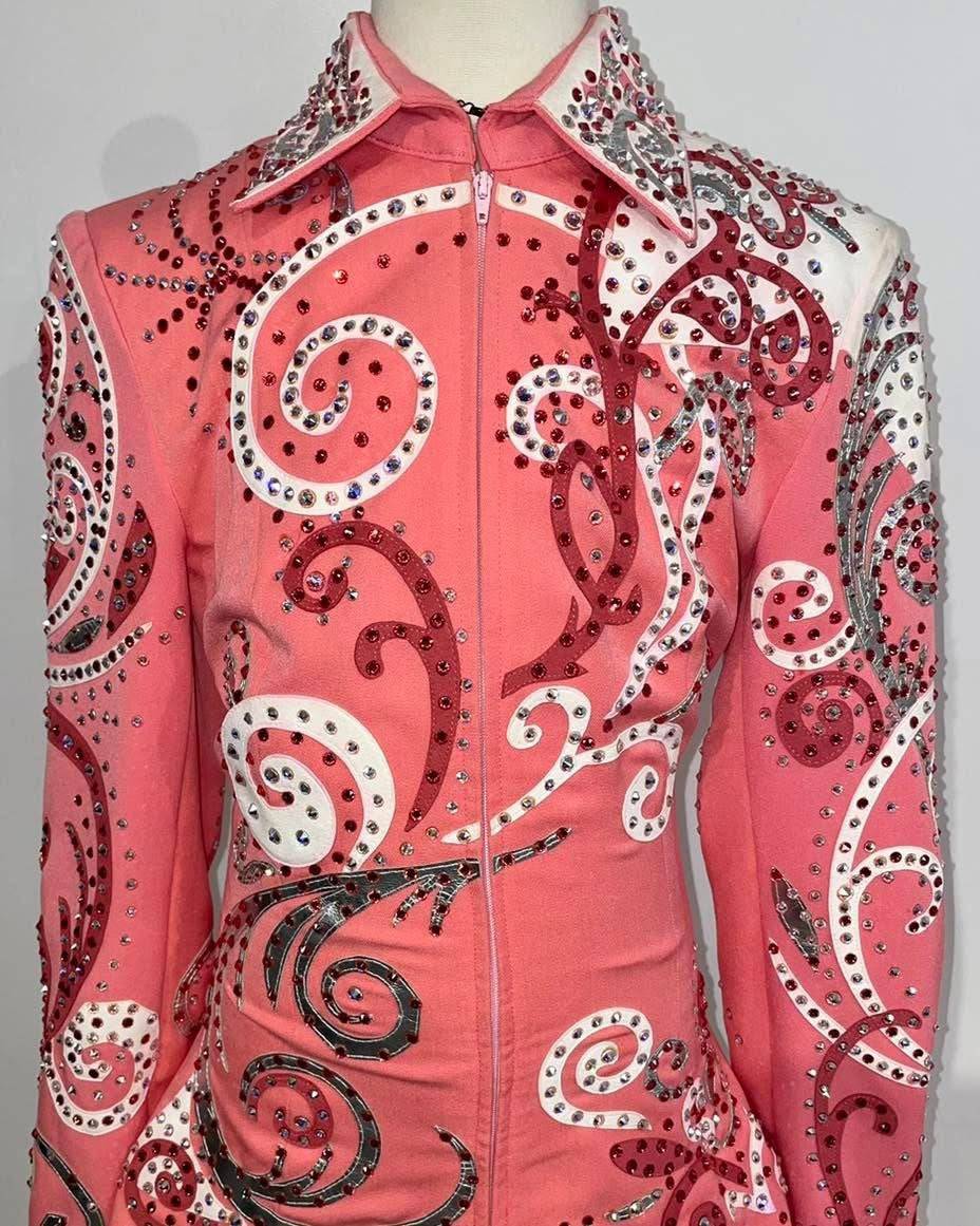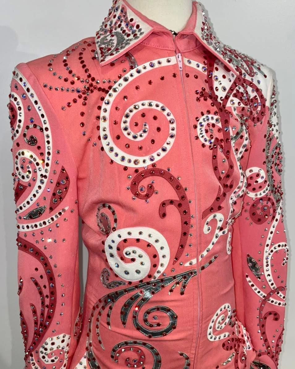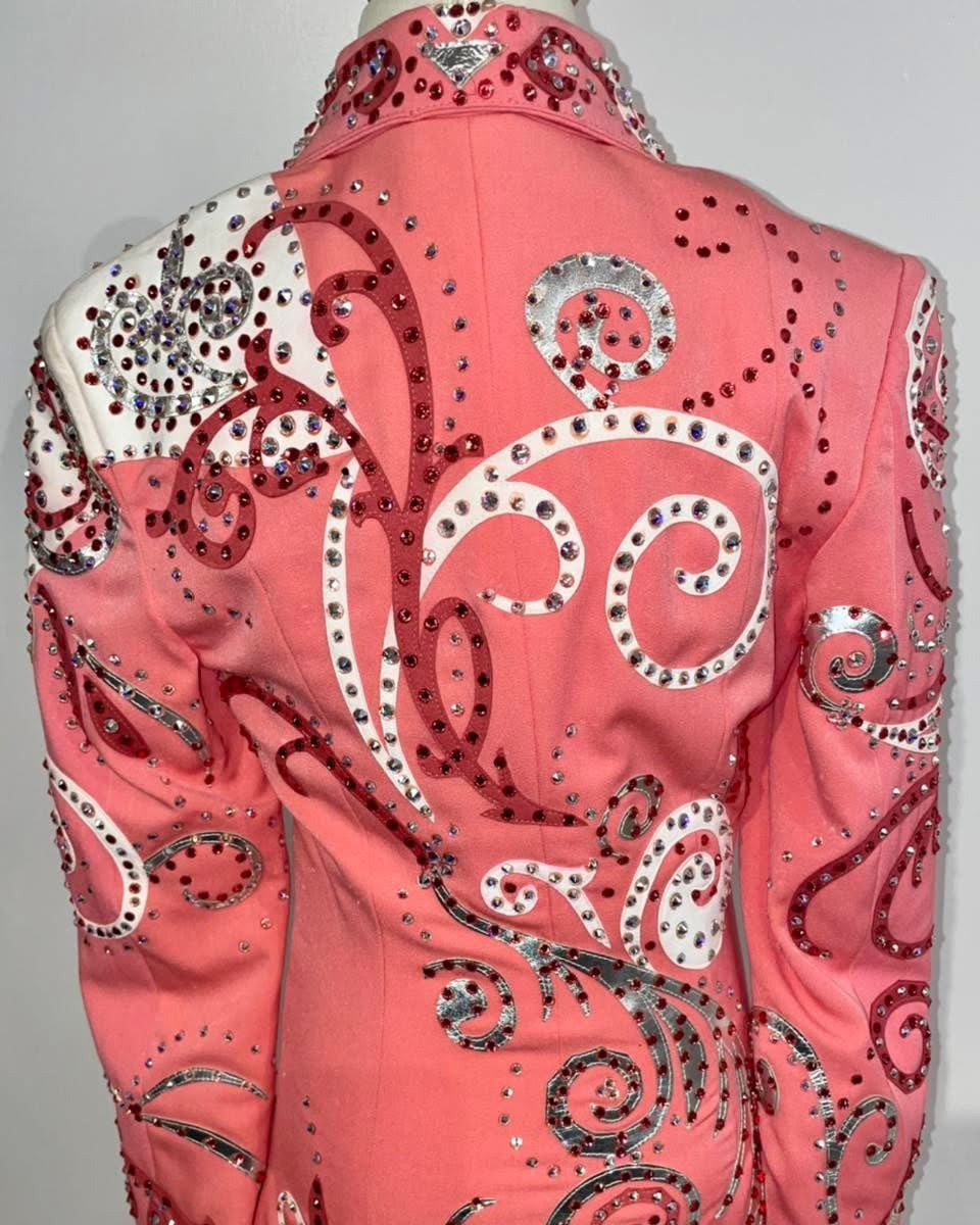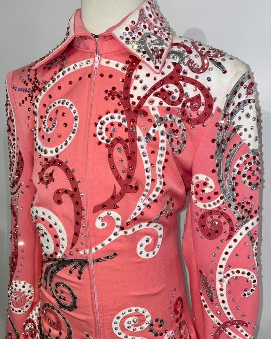 Hawkewood, girl’s/teen western set in salmon pink with silver and white trim with some stretch. This three piece set includes the jack, ultra suede chaps and pants. This option was only worn a handful of times and is in like-new condition. Approximately fits a girl’s size 12 and can go up or down a size. Asking $1,200.